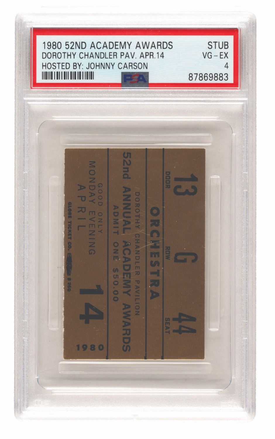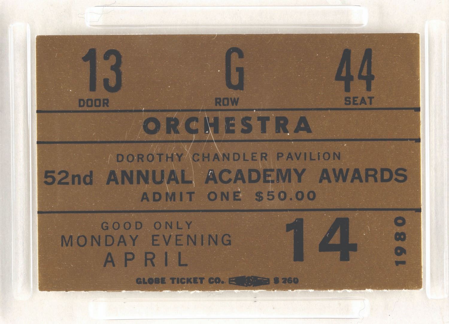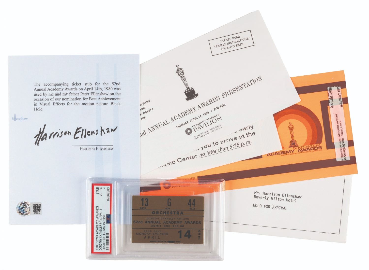 (MPAA, 1980) A golden ticket stub to the 52nd Annual Academy Awards held on April 14, 1980. A certificate signed by Harrison Ellenshaw verifies this was used by Harrison or his father, Disney Legend Peter Ellenshaw, when they were nominated for Best Achievement in Visual Effects for their work on "The Black Hole." The lot also includes two envelopes, an unused parking pass, and an instructional note from the ceremony. The ticket stub is PSA graded in VG-EX condition. The other ephemera are in fine condition with the largest envelope very good with light wear from opening and handling.
