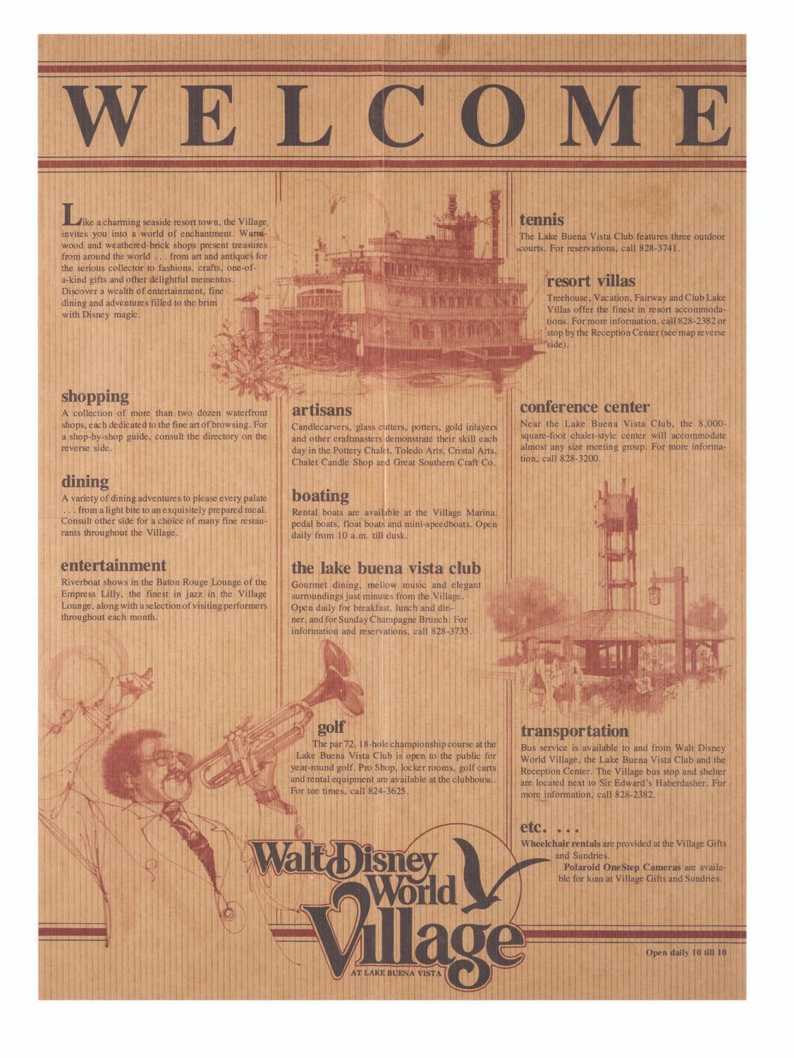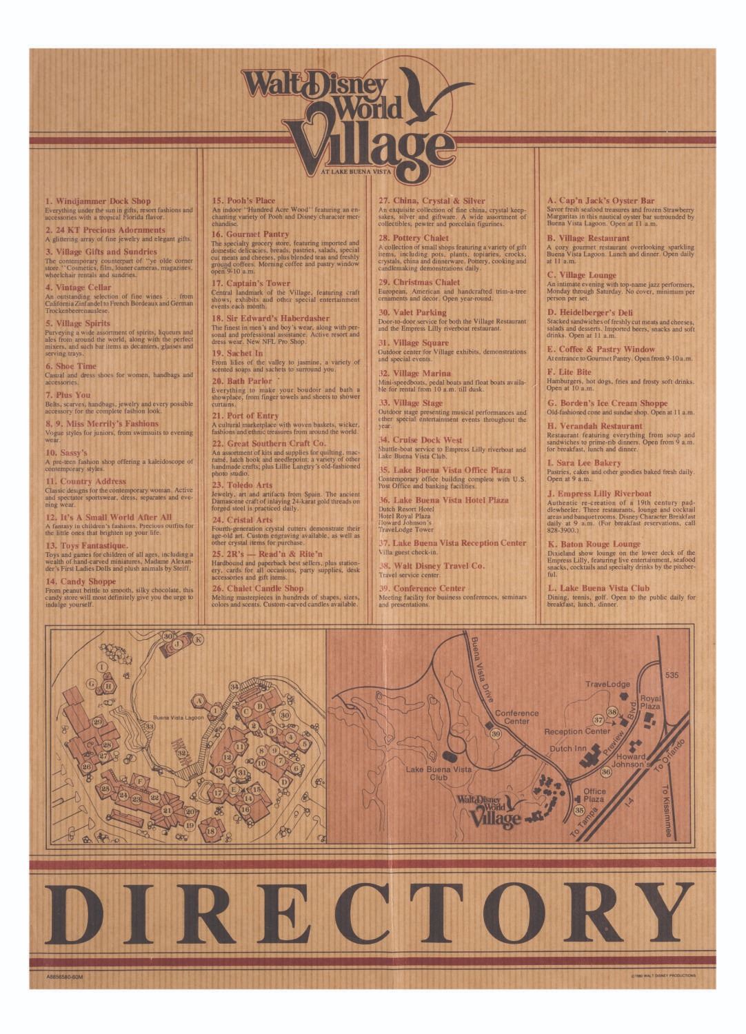 (Walt Disney World, 1980) A double-sided directory of Walt Disney World Village at Lake Buena Vista. One side features a welcome banner with brief descriptions of the entertainment, fine dining, and recreation options available at the Village. The reverse side features a comprehensive map, with a listing of stores and restaurants. Measuring 11" x 13.5", the directory is in good condition with spots of discoloration and folds.