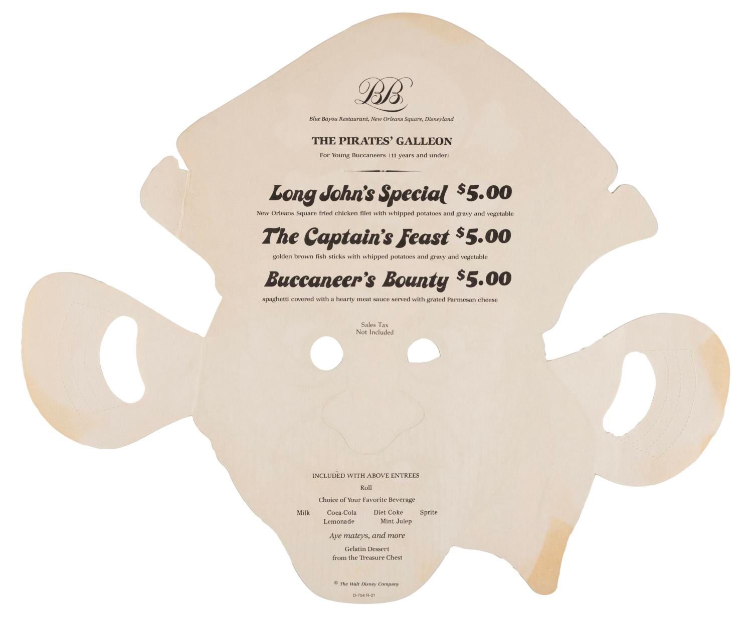(Disneyland, 1980) A children's menu from the Blue Bayou, a fine dining experience with majestic views of Pirates of the Caribbean. This colorful menu doubles as a pirate mask with dinner options listed on the reverse. Measuring 11.25” x 13.25”, the menu is in very good condition with light wear from age, and a 1.25” crease to one edge.