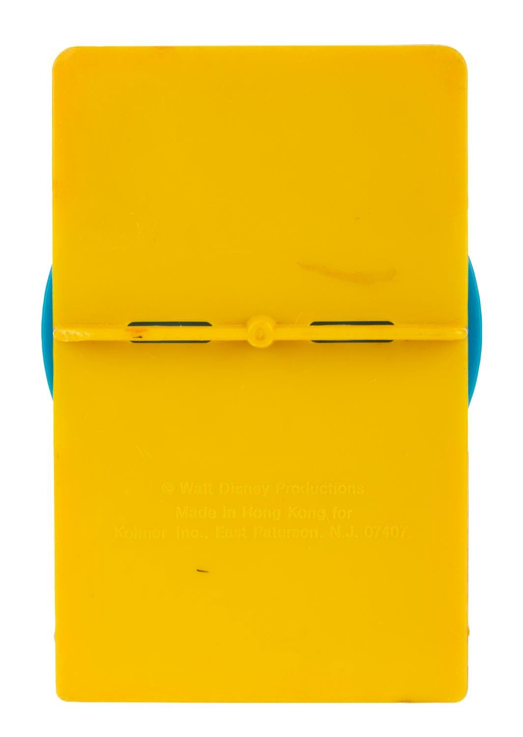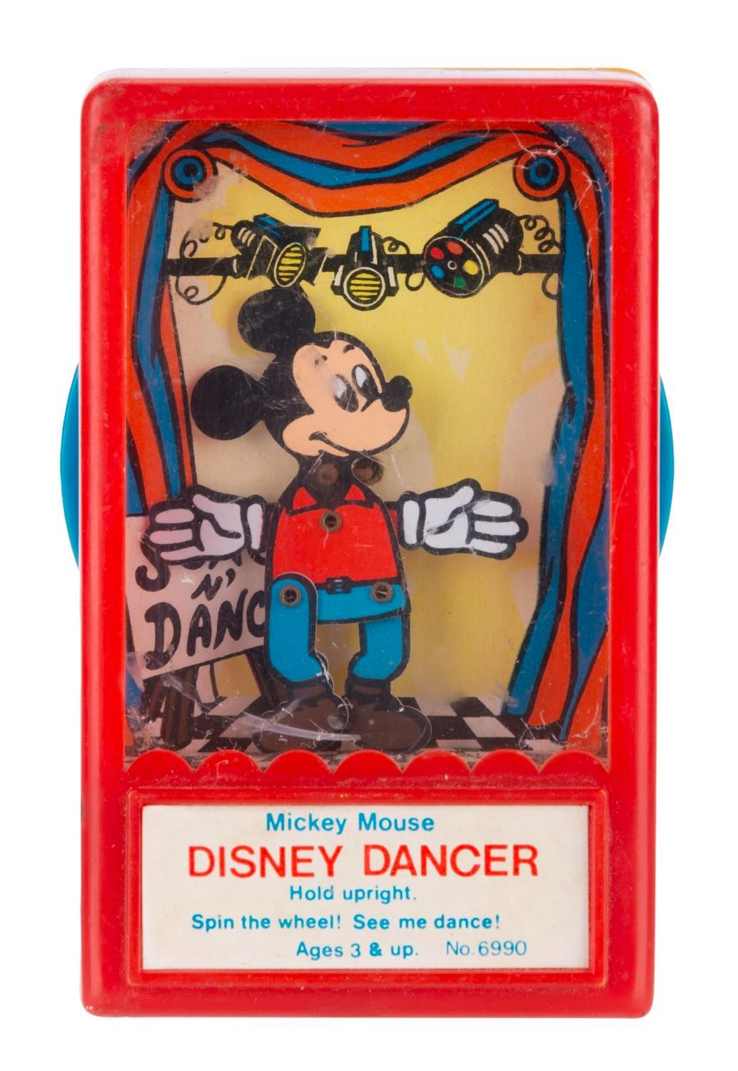 (Kohner, 1980s) A Disney Dancer Mickey Mouse Toy by Kohner. Mickey Mouse dances with a turn of the dial. Measuring 2.5"x3.75"x1", the toy is in very good working condition, exhibiting a few scuffs and wear.