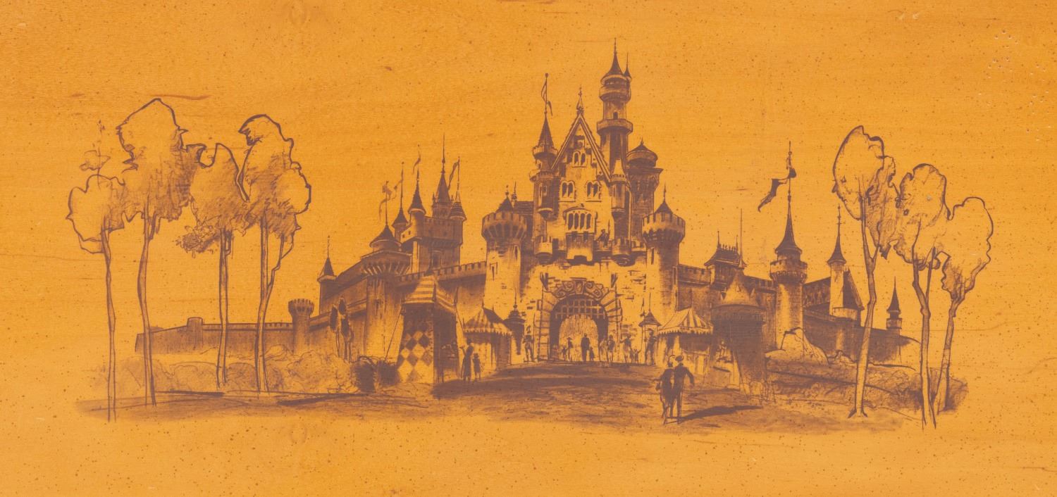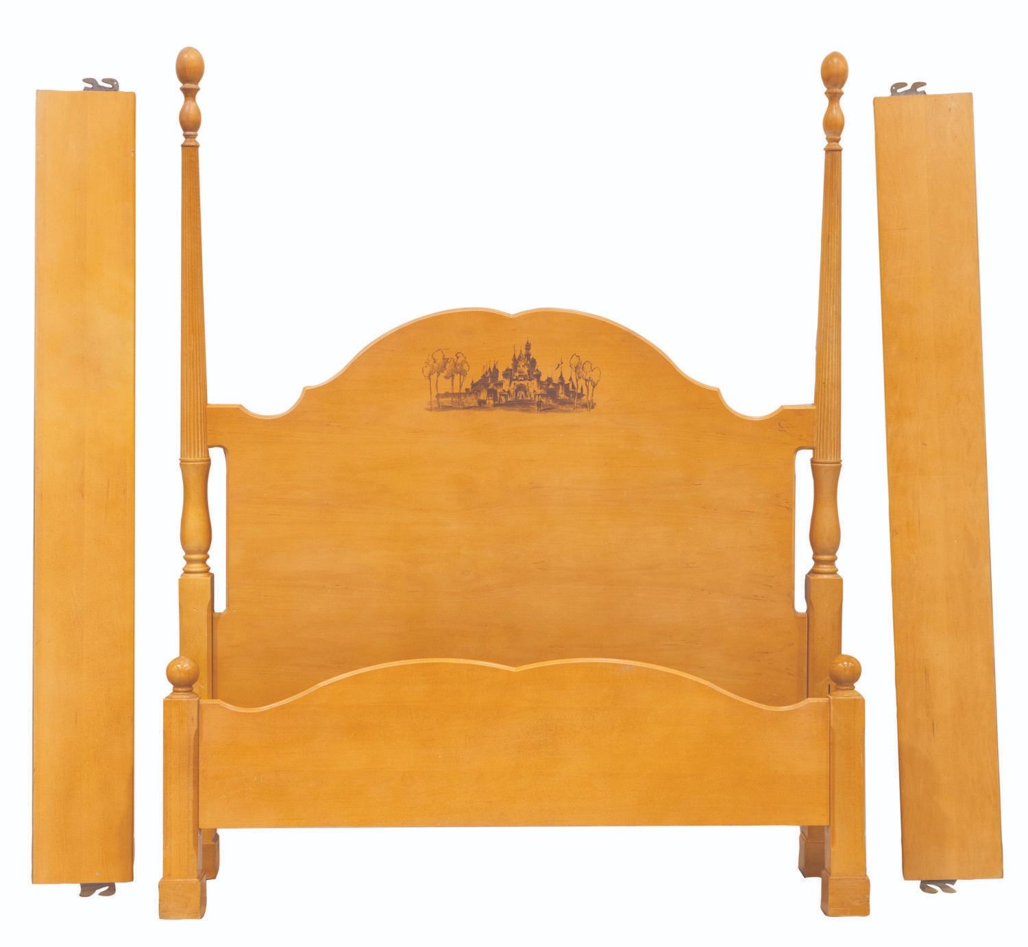 (Disneyland Hotel, 1980s) A standard queen bed frame from the Disneyland Hotel. The wooden frame, which requires assembly, includes a footboard, two side rails, and a headboard featuring a beautiful Sleeping Beauty Castle design. Measuring 88” x 90” x 83.5” tall, the bed frame displays in very good condition with typical scuffs, scratches, and wear from use.
