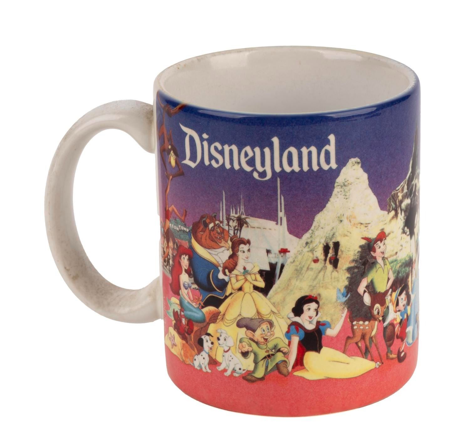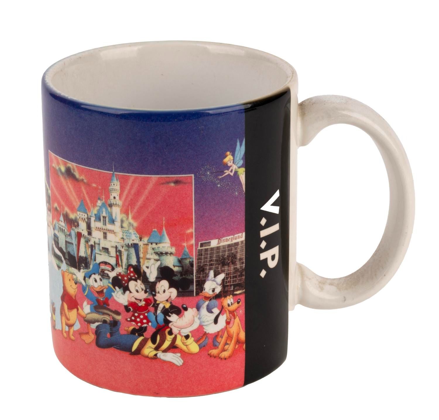 (Disneyland, 1980s) A Disneyland mug labeled V. I. P. with an image of Disney characters dating up to "Beauty and the Beast." Measuring 4.5" x 4" high, the mug is in very good condition with light wear.