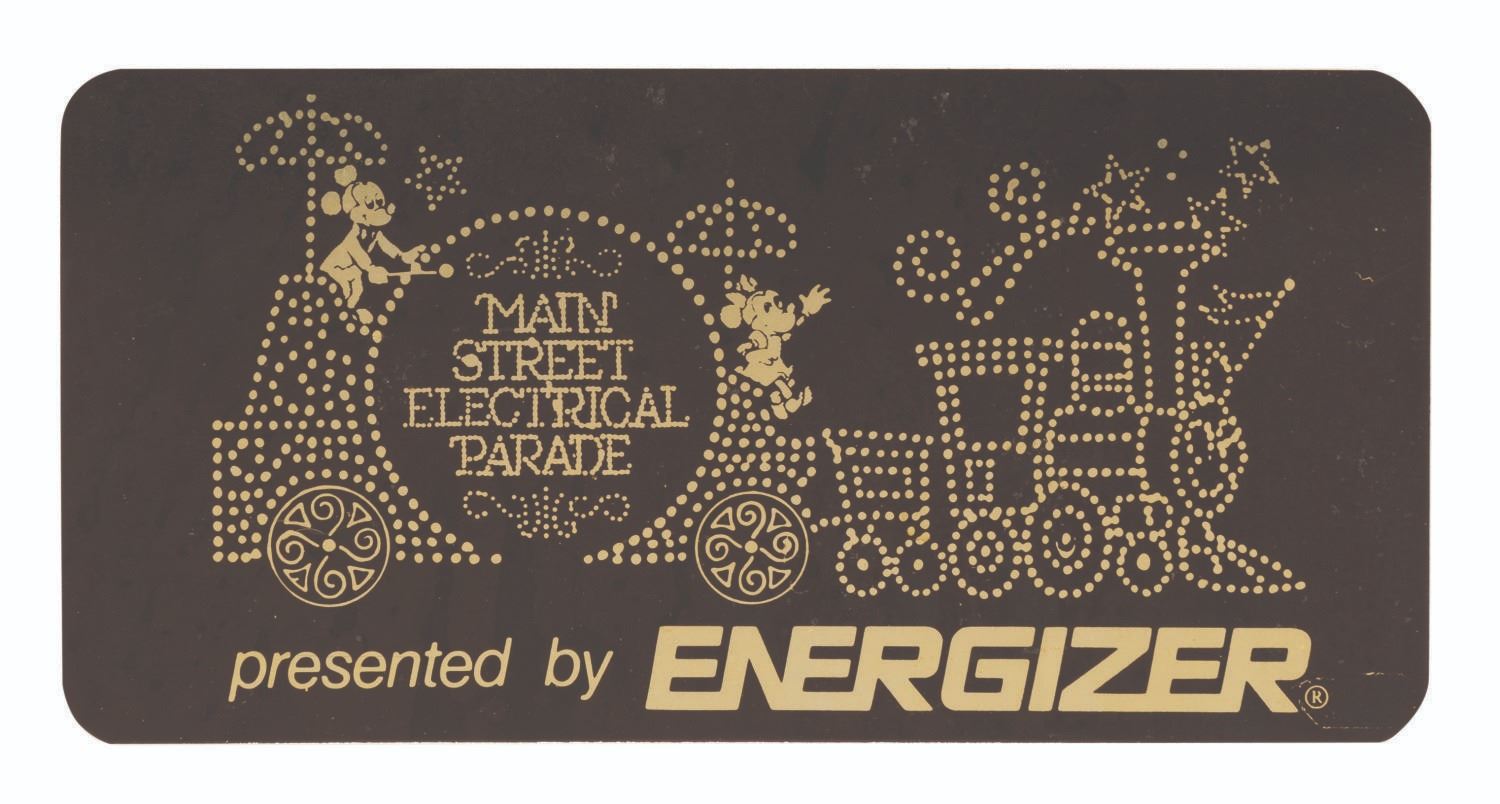 (Disneyland/ Walt Disney World, 1980s) A small metal plaque promoting Main Street Electrical Parade, sponsored by Energizer. Measuring 2” x 4.25”, the plaque is in very good condition with light wear from use and tape residue on the back.