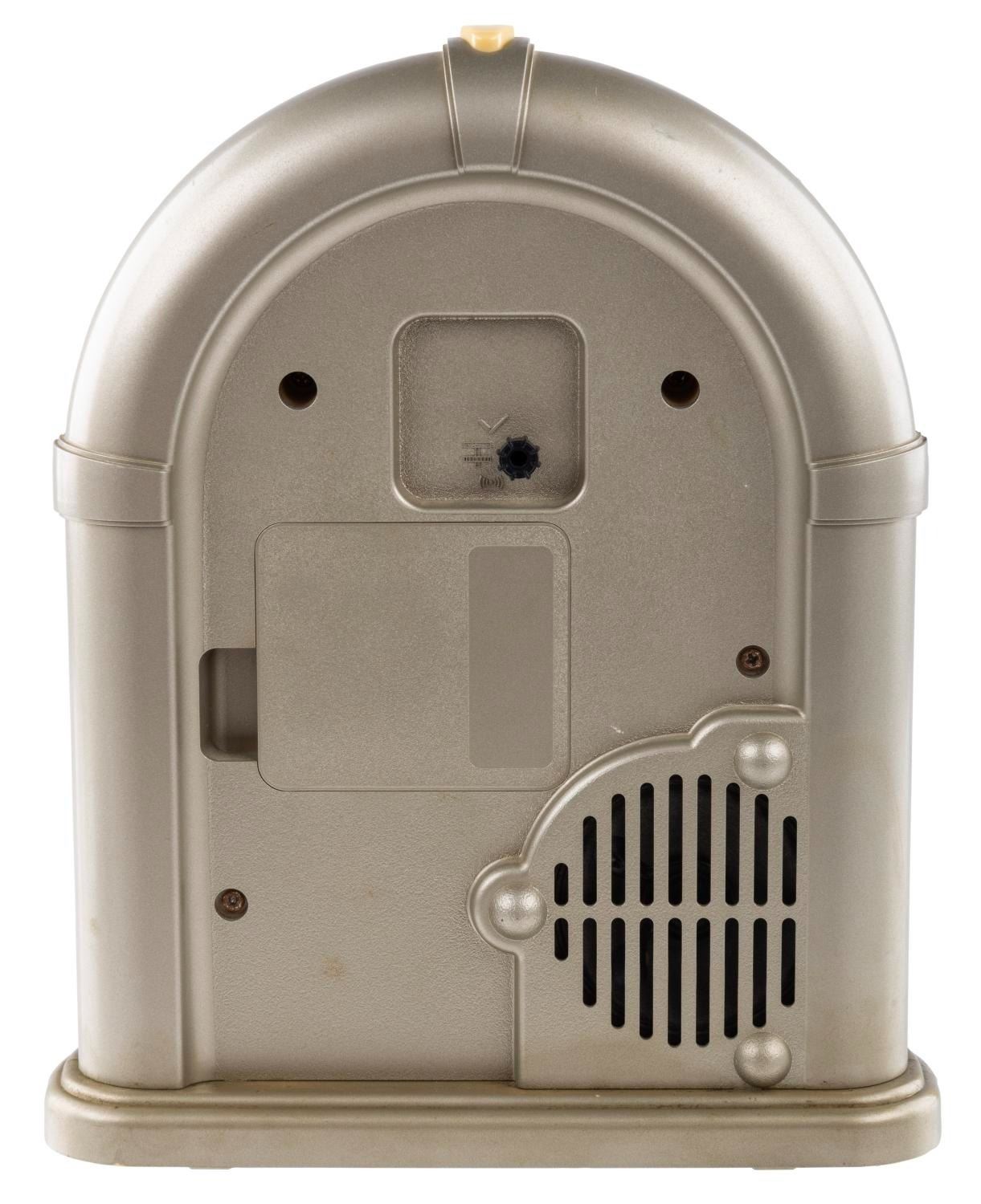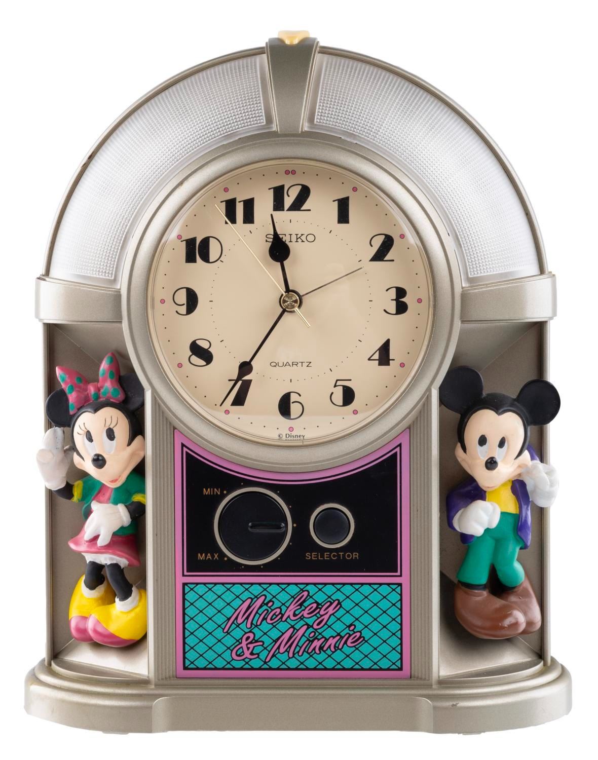 (Seiko, 1980s) An original Mickey Mouse & Co. Jukebox alarm clock featuring Mickey and Minnie Mouse. With three "AA" batteries (not included), the alarm clock plays one of four "8-bit" style Disney tunes as the alarm: "Bibbidi-Bobbidi-Boo," "When You Wish Upon A Star," "The Main Street Electrical Parade," and "It's a Small World." Measuring 6.25" x 2.5" x 8" tall, the clock is in very good working condition with slight color shift from age.