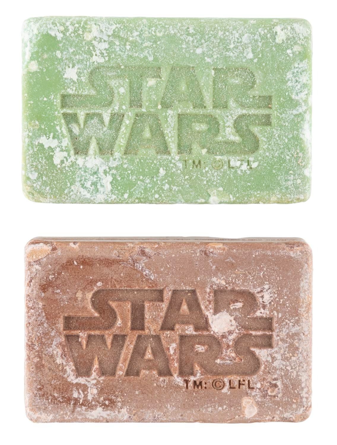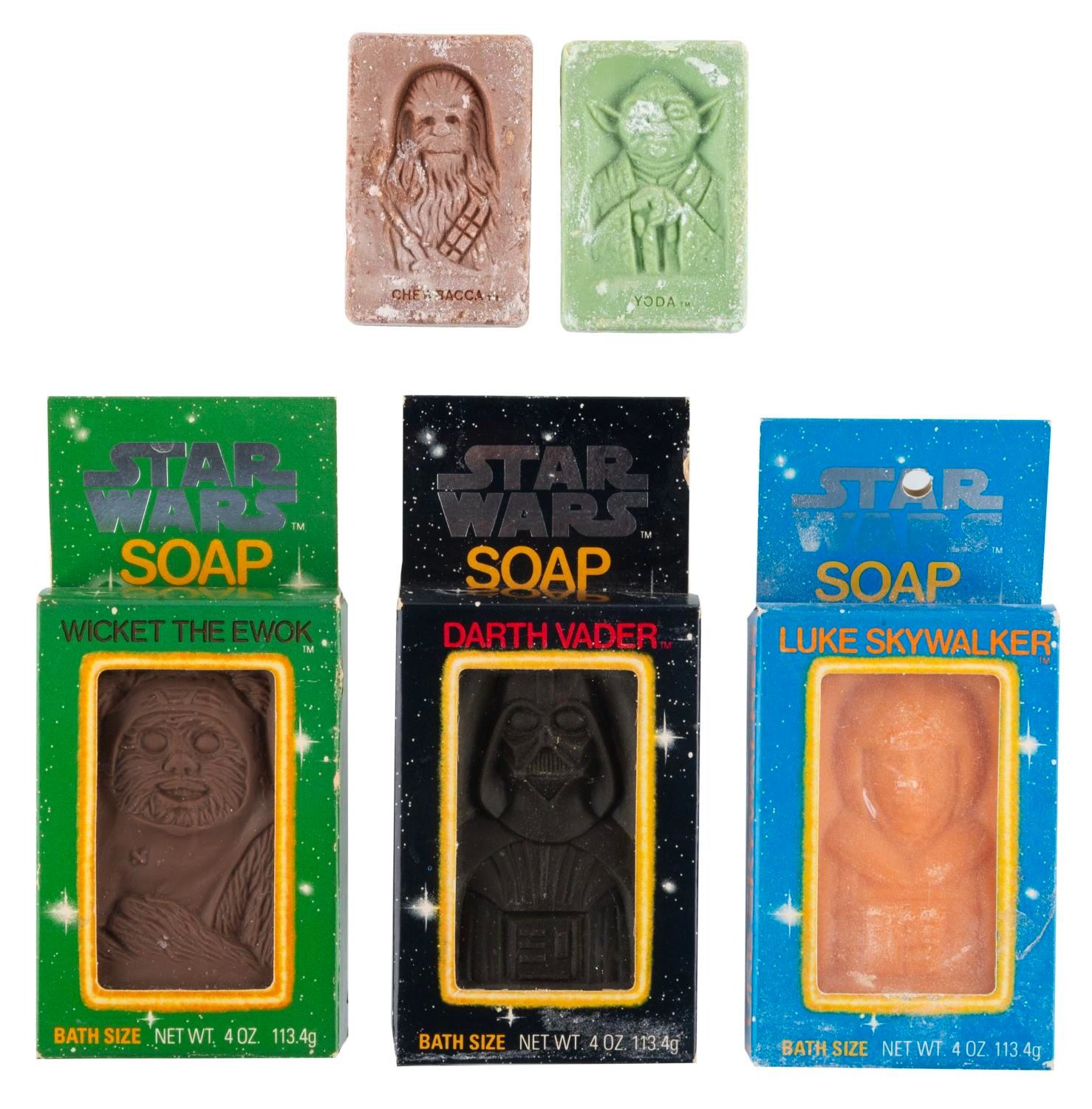(Omni Cosmetics, 1981-82) A collection of five Star Wars soap, including bath-size bars of Chewbacca and Yoda, and a boxed set with individual bars of Darth Vader, Luke Skywalker, and Wicket the Ewok. Measuring 2.5” x 5.5”, the boxed soaps are in good condition with wear to the boxes and light wear to the soaps inside. Measuring 1.5” x 2.5”, the loose bars are in fair condition with wear throughout from age and handling. The soap is intended for collecting purposes only.