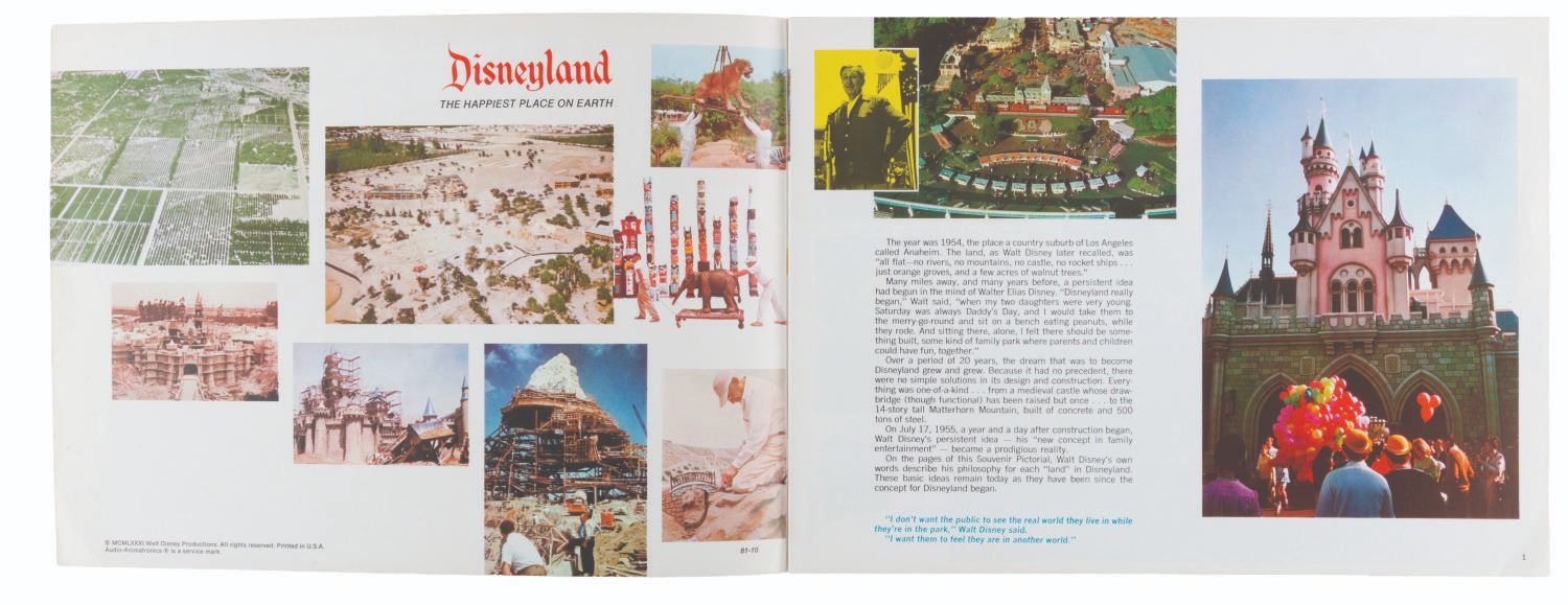 (Disneyland, 1981) A Walt Disney’s Disneyland pictorial souvenir book featuring colorful photos from around the Park. Measuring 8.75" x 11.75", the guide is in good condition with some creasing to the edges of the cover and surface wear along the spine.