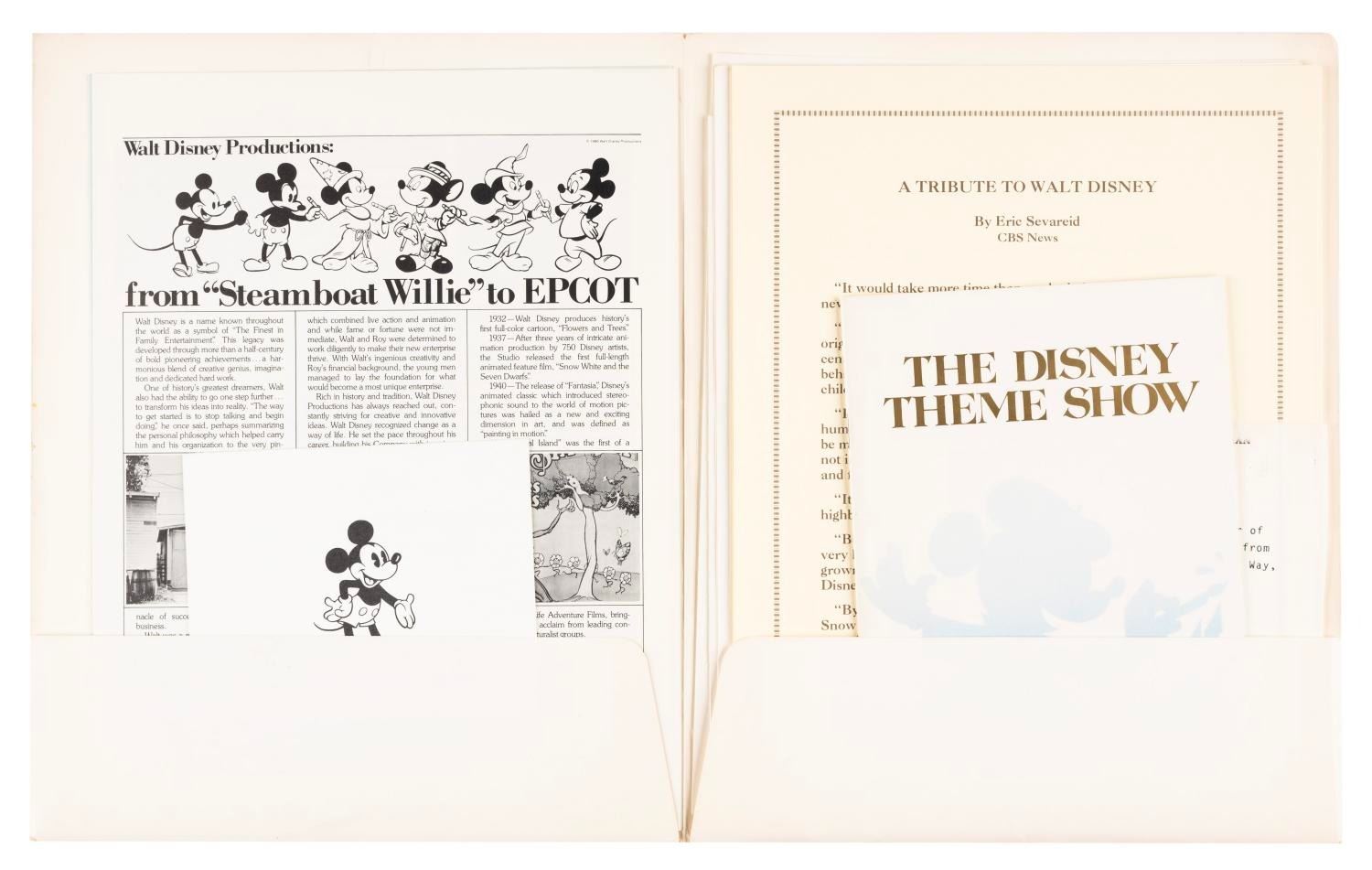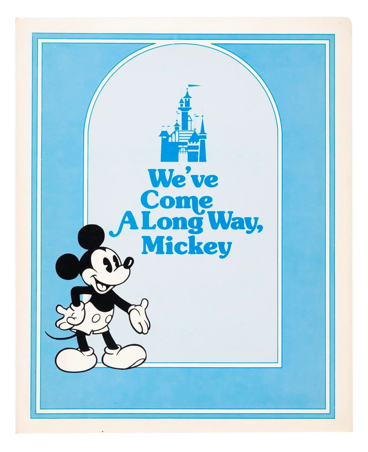 (Disneyland, 1982) A folder from the "We've Come a Long Way, Mickey" Cast Member program celebrating the history of the Walt Disney Company in 1982. Folder contents include an invitation, overviews of animation and Disney Company history from Steamboat Willie to EPCOT, addresses from Card Walker and Donn Tatum, and a copy of the very rare booklet The Disney Theme Show Volume II. Measuring 9.5" x 11.5", the kit is overall in very good condition, with typical light handling wear to the outside folder.