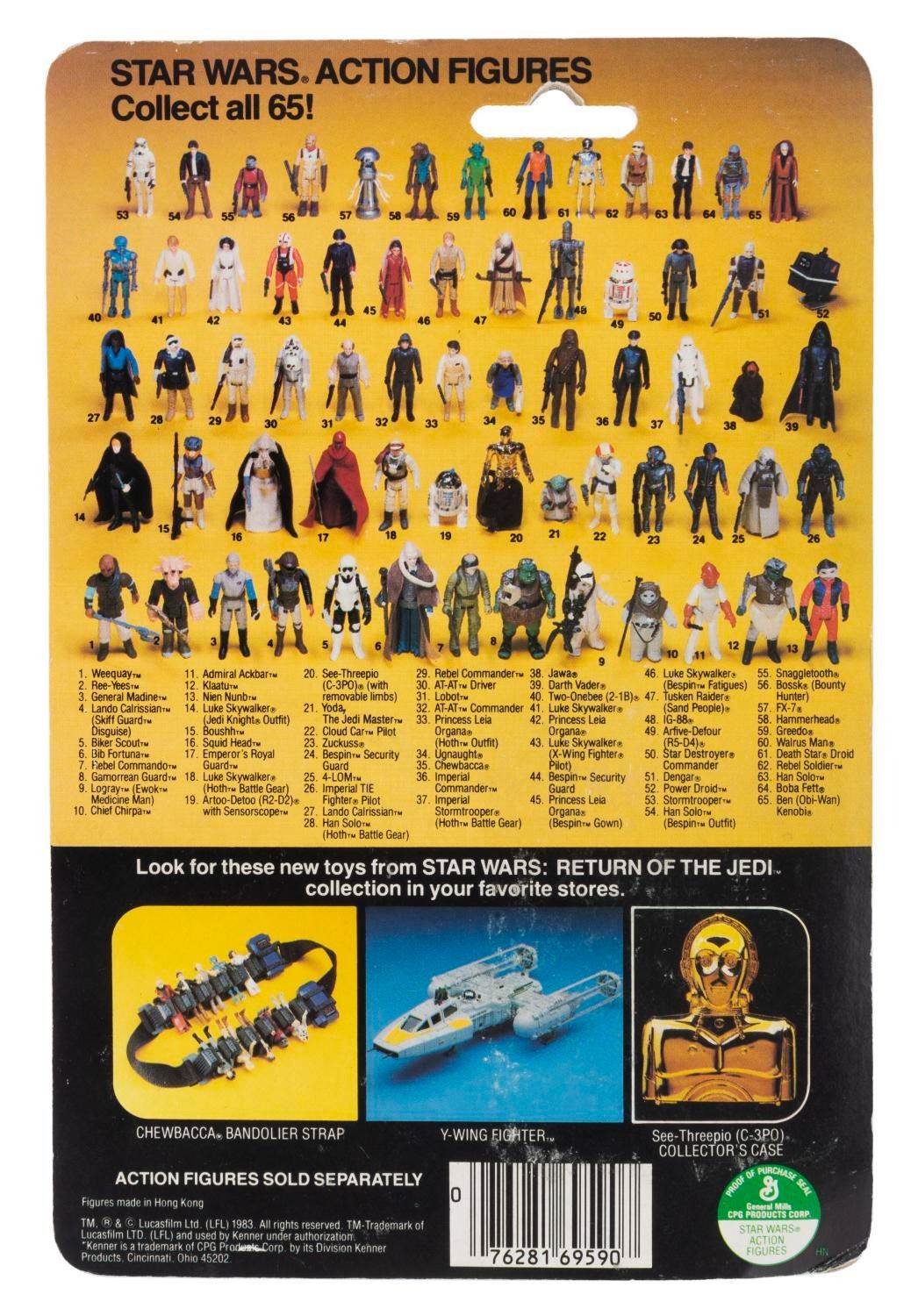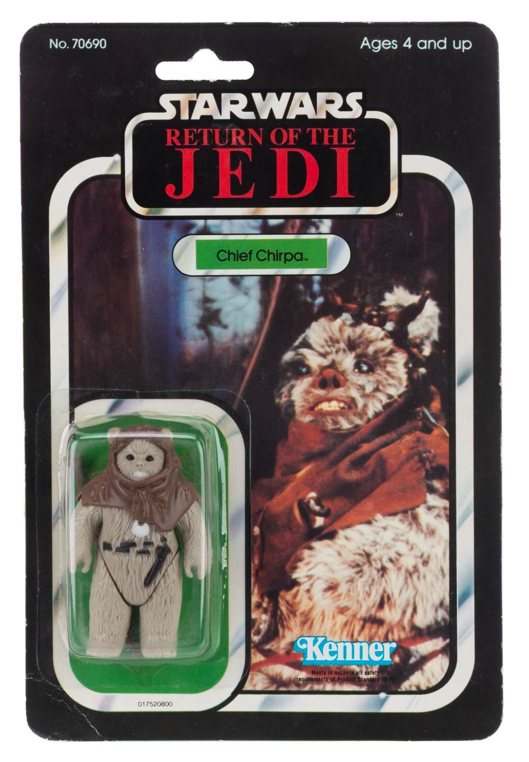 (Kenner, 1983) A “Return of the Jedi” Chief Chirpa action figure on the original card. The 2.75” figure is in fine condition, and the 6” x 9” card is in good condition with edge wear, creases to the lower left corner, and a slight dent and crease to the plastic bubble’s top right edge.