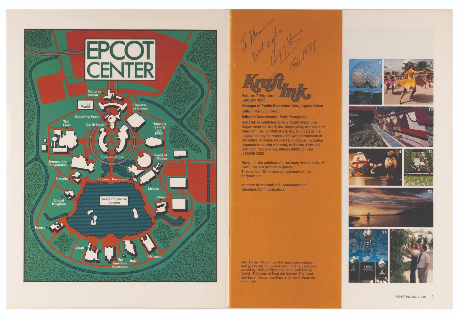 (Disney, 1983/1984) A January 1983 issue of Kraft Ink announcing the opening of The Land at EPCOT Center, signed on the interior by Henry A. Robitaille, the