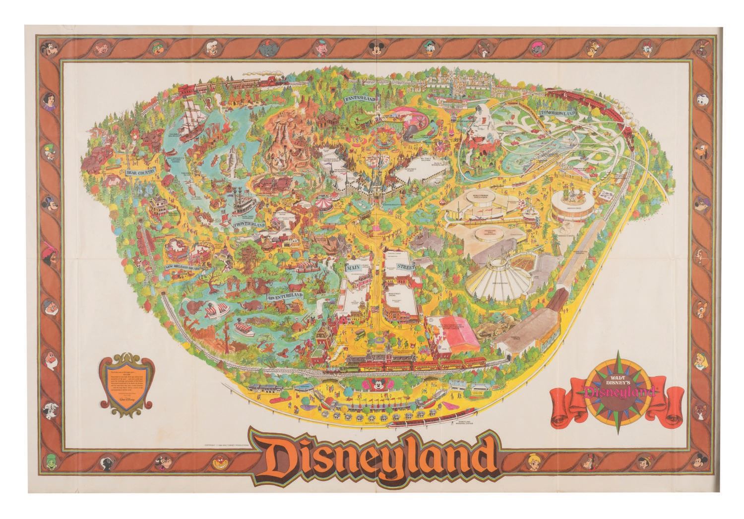 (Disneyland, 1984) An original souvenir map of Disneyland from 1984. This updated version of the Disneyland map features the recently added World Premier Circle Vision theater which opened July of 1984. Measuring 45"x30", the map is in very good condition, with spots of discoloration, and creases and wear along original fold lines.