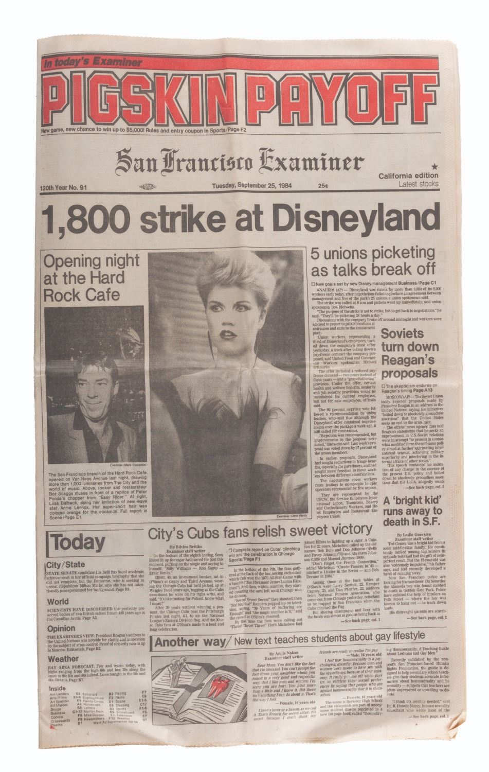 (San Francisco Examiner, 1984) The Tuesday, September 25, 1984 issue of the San Francisco Examiner with a cover story on the 22-day Cast Member strike at Disneyland. Measuring 13.75" x 22.5", the newspaper displays in very good condition with folds, creases, handling wear, and discoloration from age.