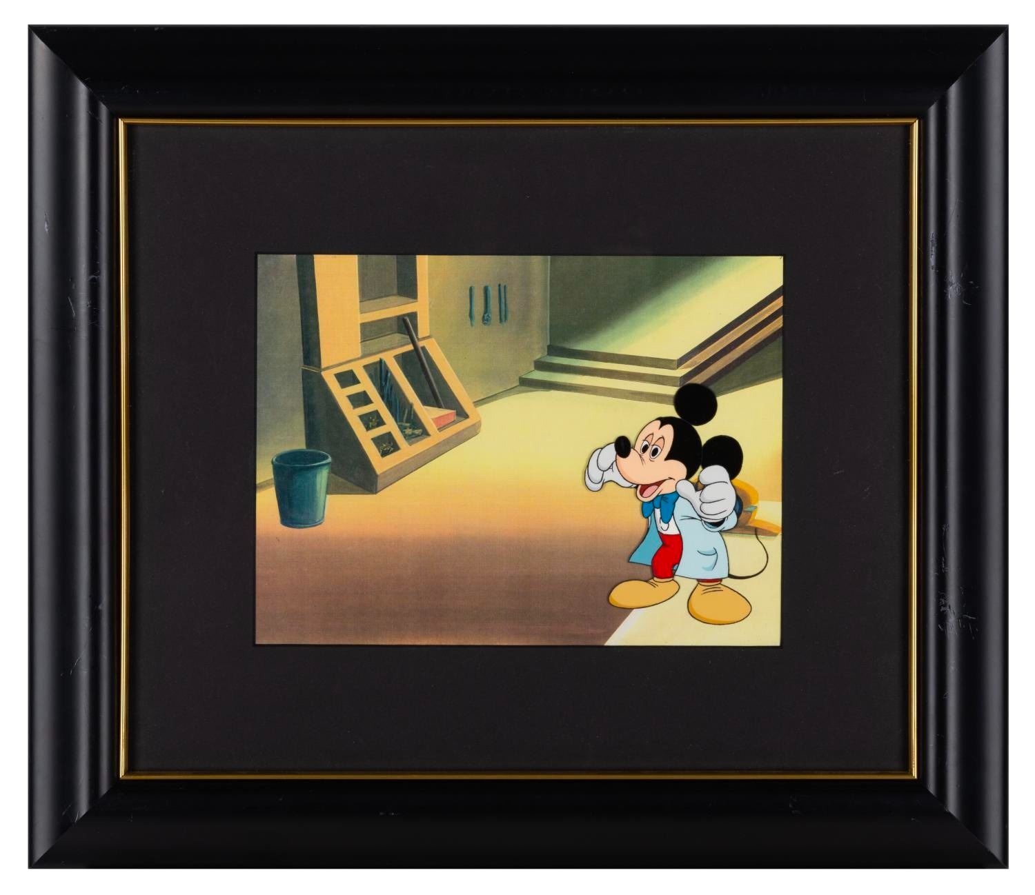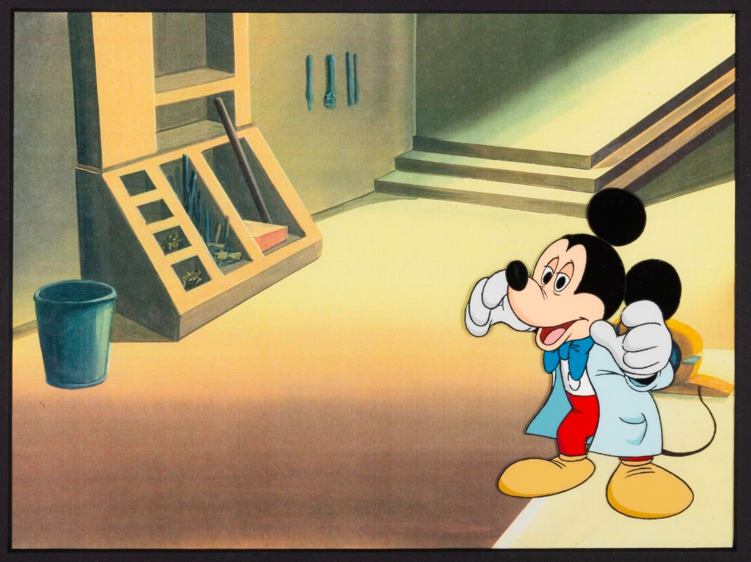 (Coca-Cola, 1984) An original production cel of Mickey Mouse in a lab coat from a Fanta soda commercial, with a color copy background. With a character image size of 4.25" x 5.25" on an 8.5" x 11.5" visible cel, the piece is in very good condition with very slight line loss.