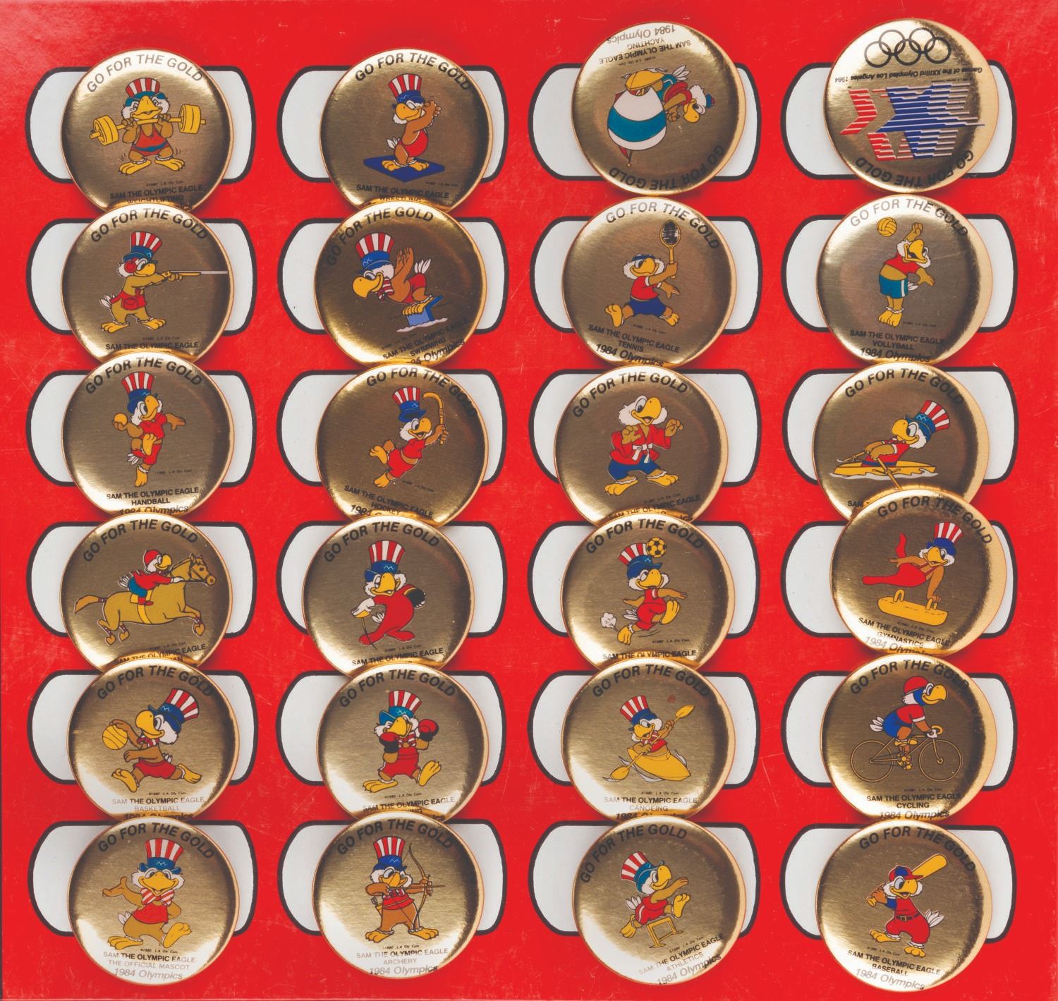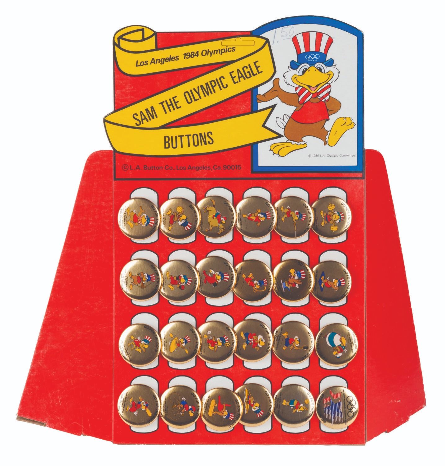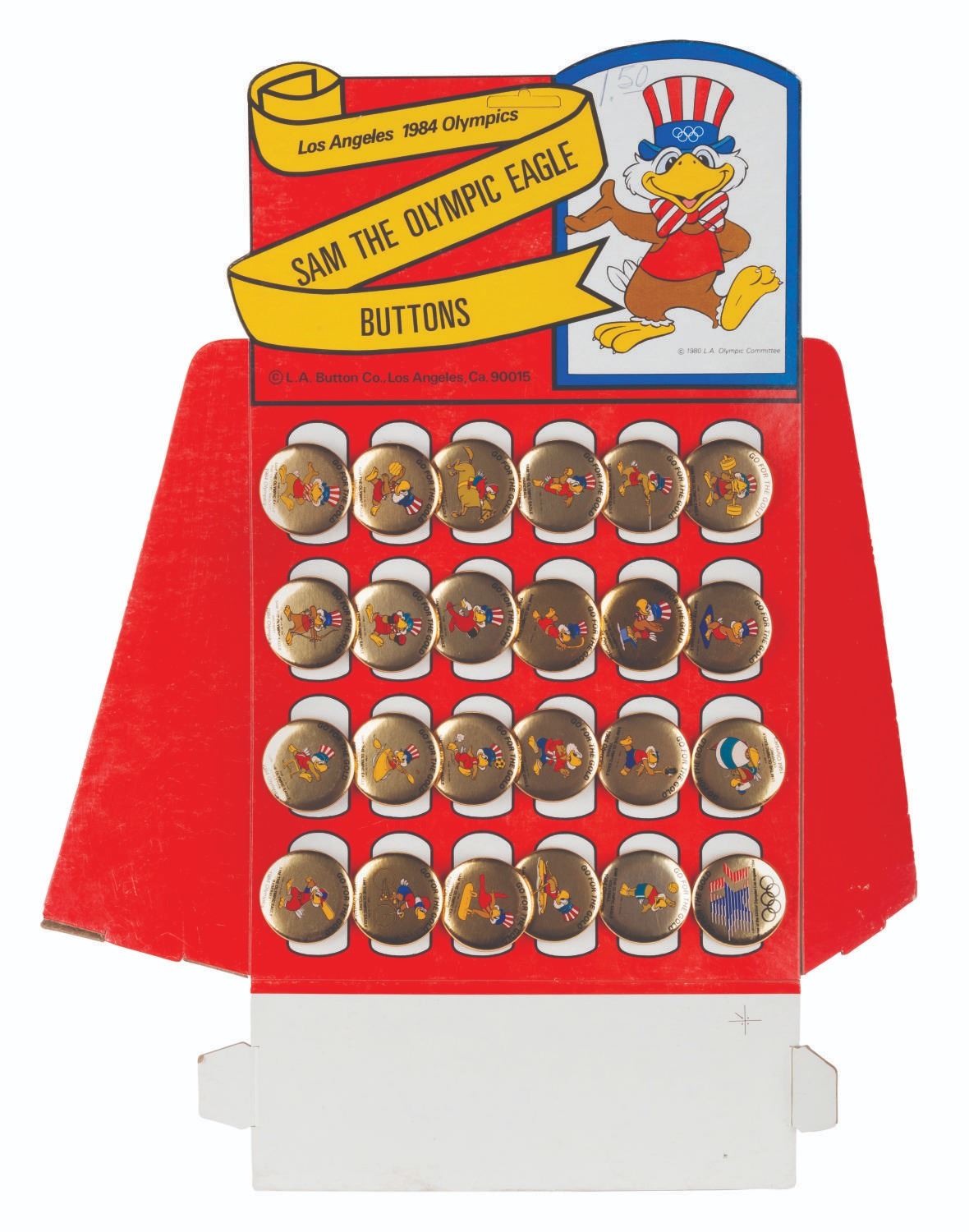 (L.A. Olympics Committee, 1984) A complete countertop display of 24 buttons featuring the Olympic Mascot Sam the Eagle. Sam was designed by Disney Legend Bob Moore. Measuring 17" x 10" x 4" standing, the display is in very good condition with light wear and a price written in ink by Sam's hat. The 1.75" gold-colored buttons are in very good to fine condition.