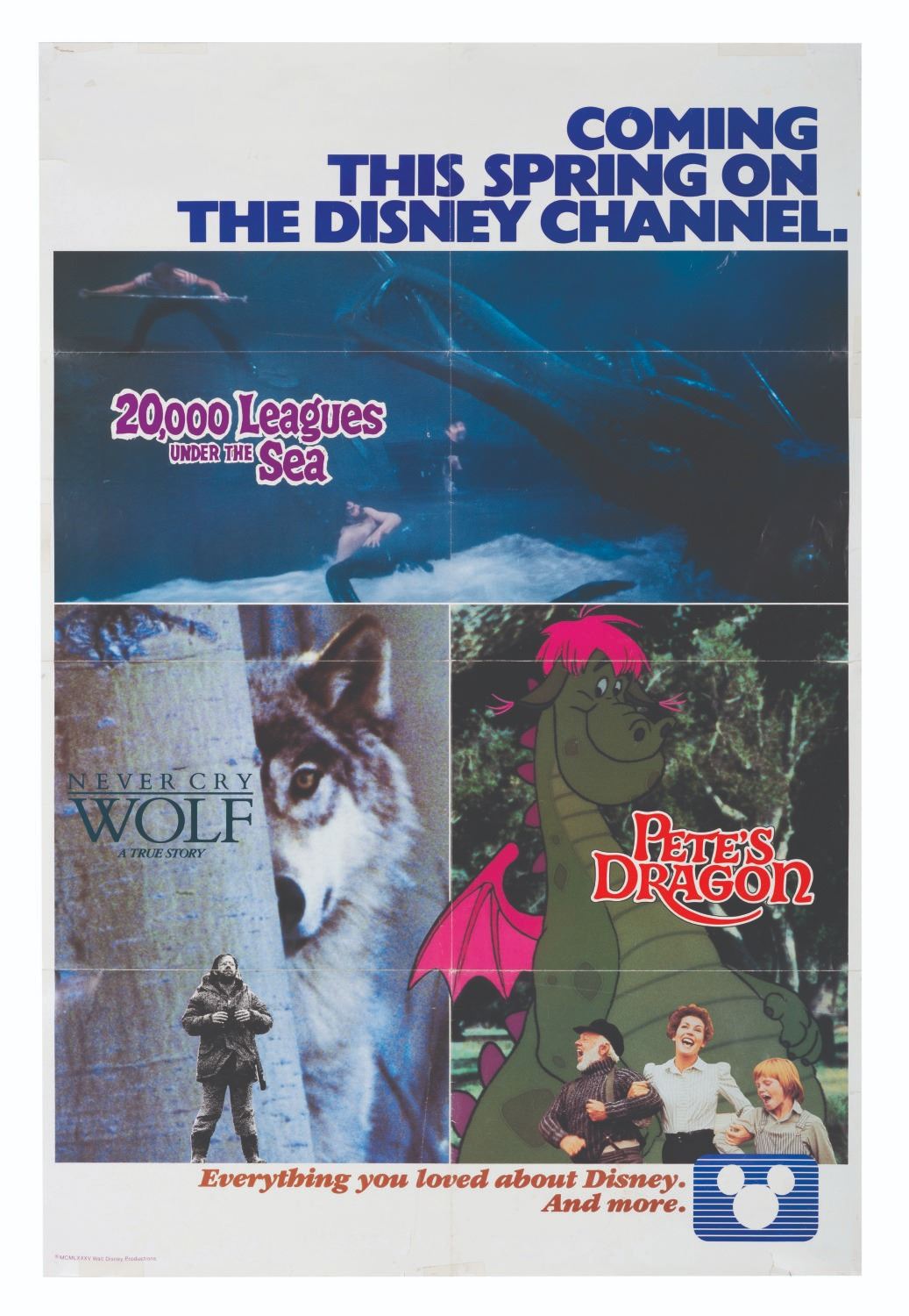 (Disney, 1985) An early poster promoting "20,000 Leagues Under the Sea,” "Never Cry Wolf,” and "Pete’s Dragon” on the Disney Channel. Measuring 27” x 41”, the poster displays in fair condition with folds, creases, discoloration from age, spotting, wear, visible tape repair, and edge tears up to 2” long.