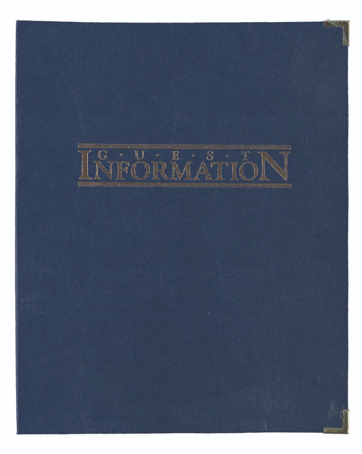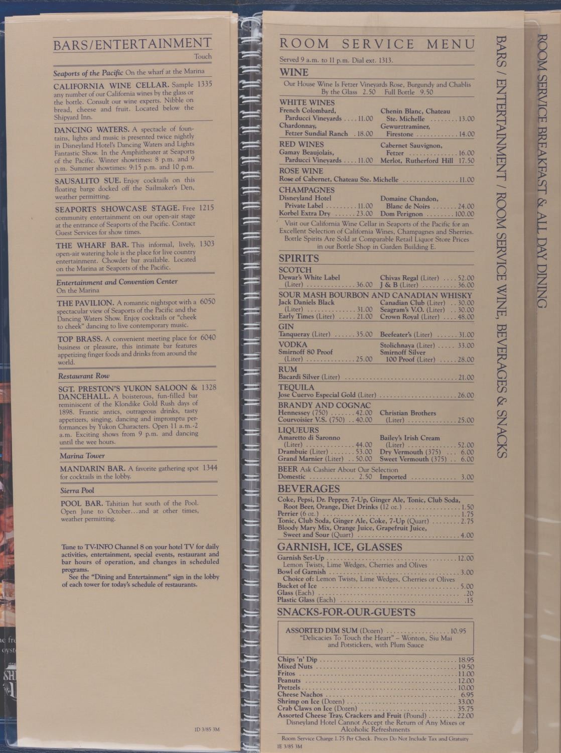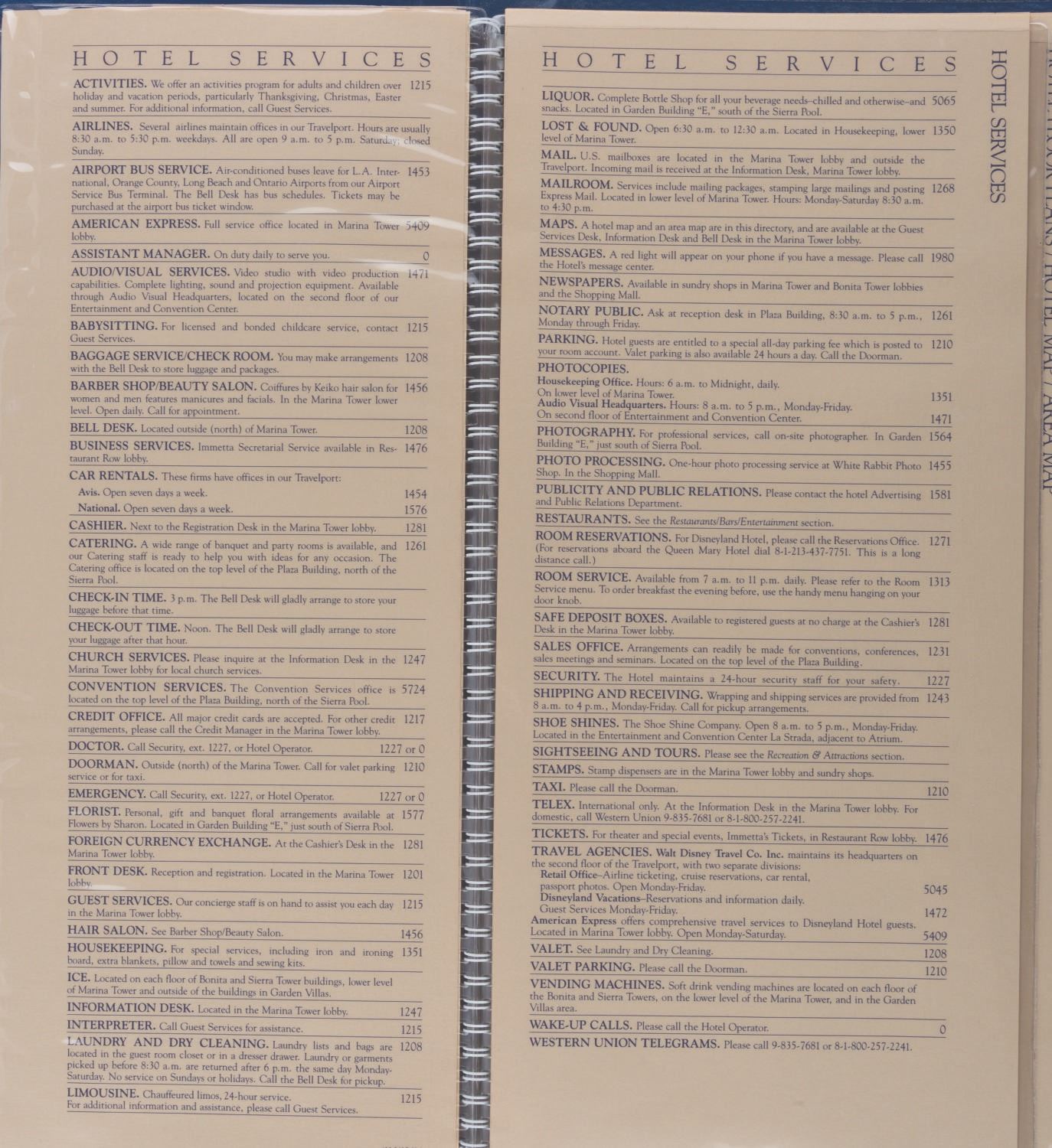 (Disneyland Hotel, 1985) A Disneyland Hotel Guest Information packet. Included within are a room service menu, a hotel map, amenities, a jogging guide, a shopping guide, a history of the hotel, a Tennisland guide, four pages of stationery, four envelopes, a September 1, 1985 Disneyland Hotel magazine with a Six Flags Magic Mountain cover, and two children's menus shaped like Pinocchio and Mickey Mouse masks. This detailed packet offers a comprehensive overview of the Disneyland Hotel during the 1980s. Measuring 13.75 " x 17 ", the large book is in very good condition with creases and wear.