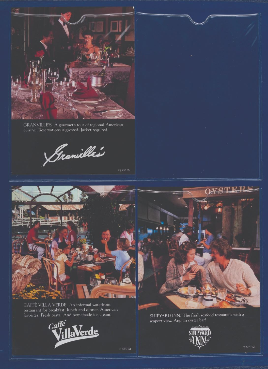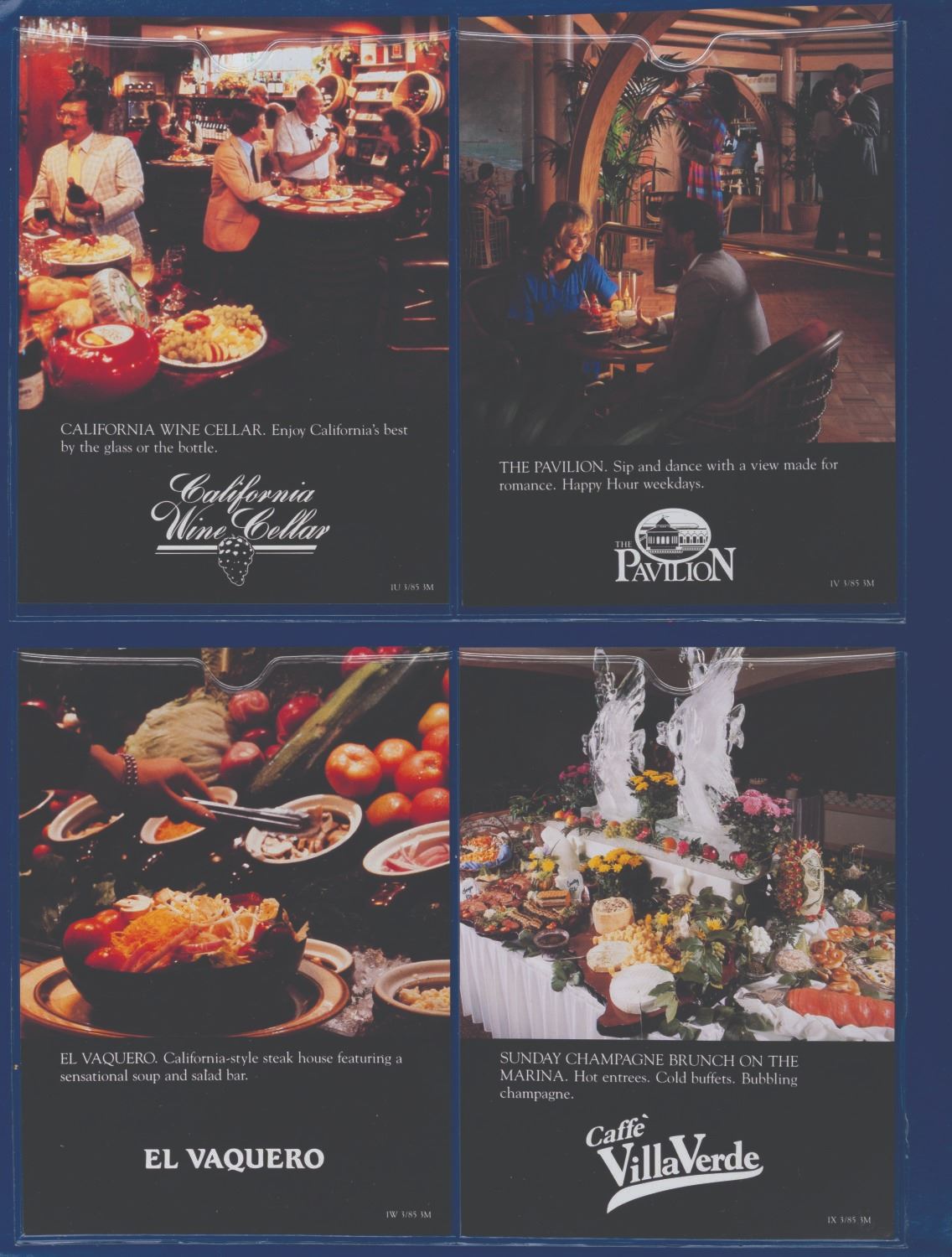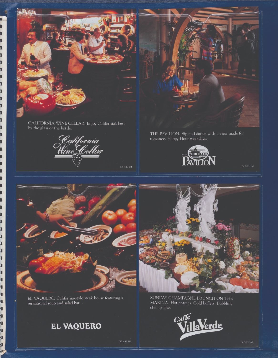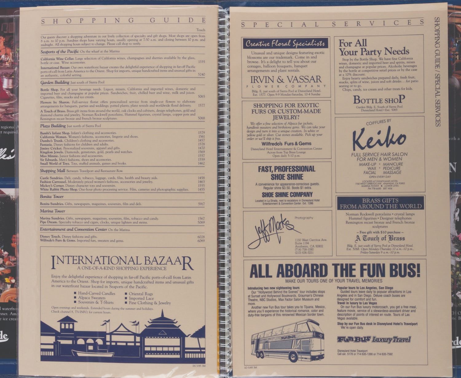(Disneyland Hotel, 1985) A Disneyland Hotel Guest Information packet. Included within are a room service menu, a hotel map, amenities, a jogging guide, a shopping guide, a history of the hotel, a Tennisland guide, four pages of stationery, four envelopes, a September 1, 1985 Disneyland Hotel magazine with a Six Flags Magic Mountain cover, and two children's menus shaped like Pinocchio and Mickey Mouse masks. This detailed packet offers a comprehensive overview of the Disneyland Hotel during the 1980s. Measuring 13.75 " x 17 ", the large book is in very good condition with creases and wear.
