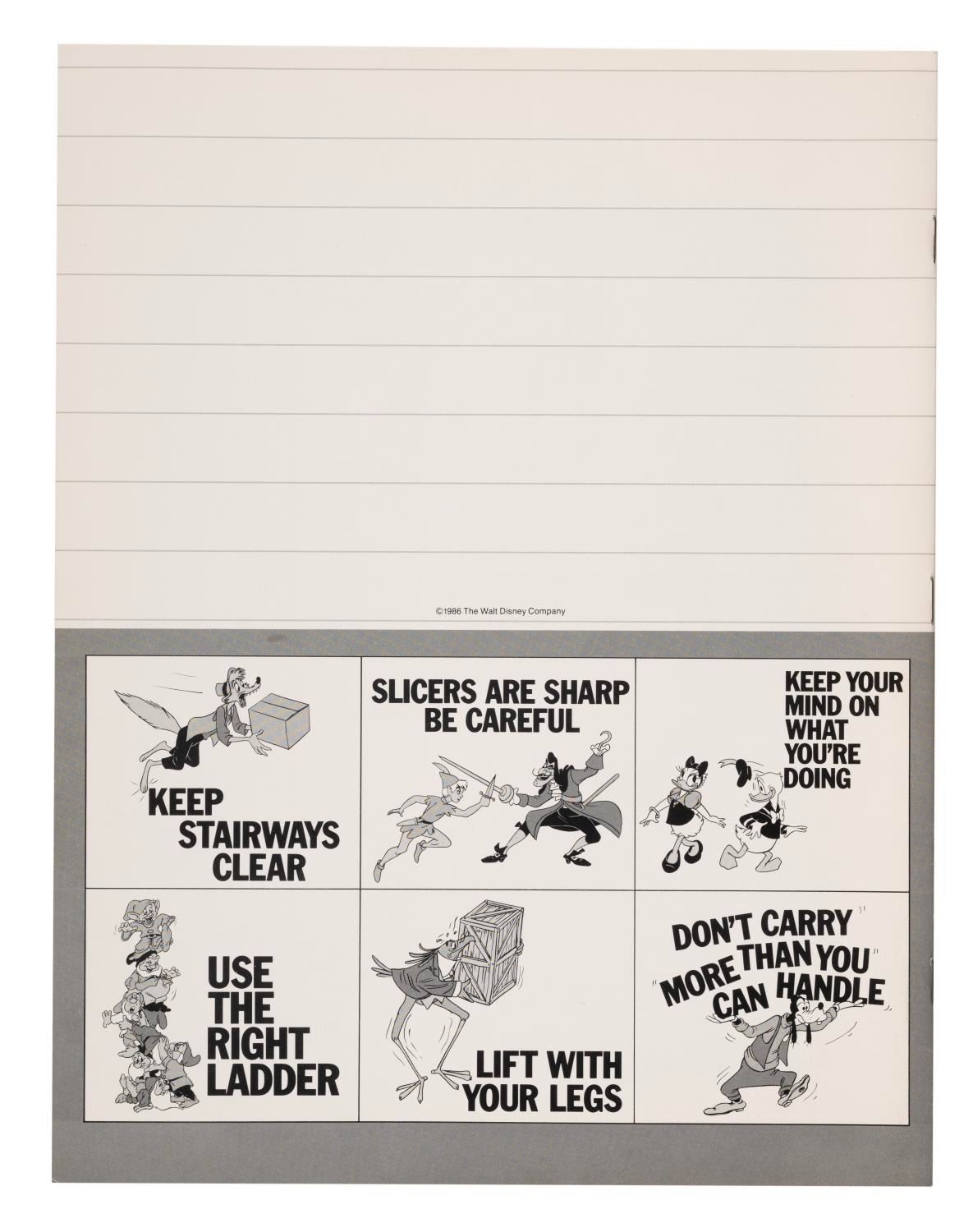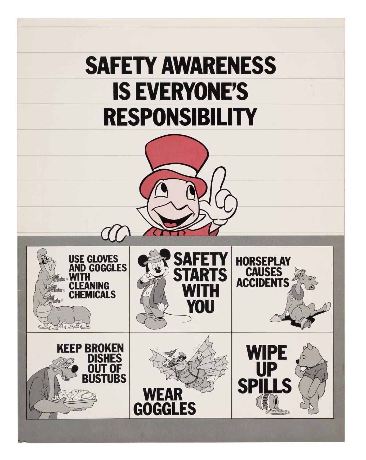 (Disneyland, 1986) A Cast Member safety awareness booklet describing best practice instructions for handling workplace accidents, injuries, sudden illness, fire, and other calamities that could befall a Disney Park employee. Measuring 8.5" x 11", the booklet is in very good condition with light soiling on the covers, edge wear, and creasing near the spine.