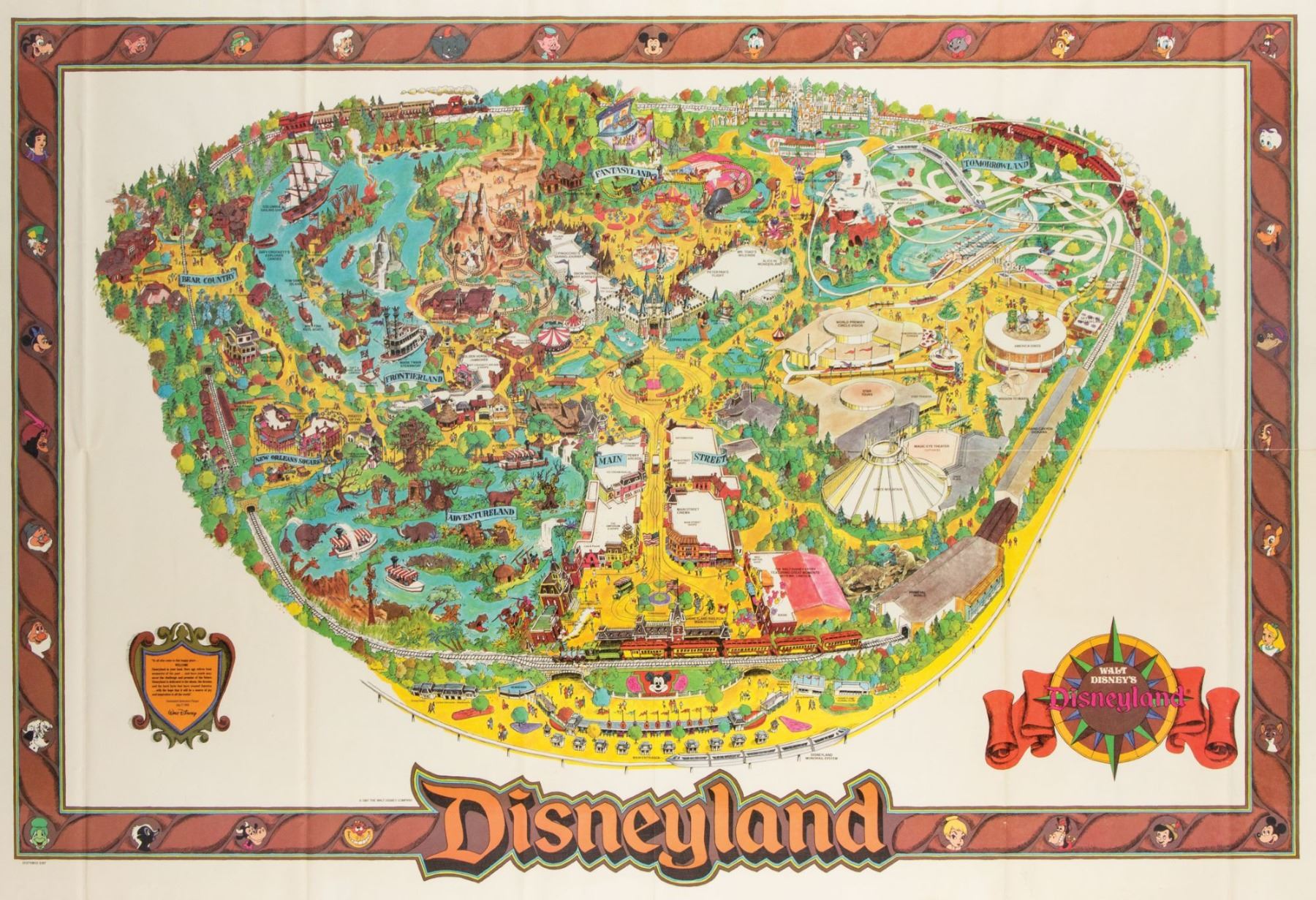 (Disneyland, 1987) A large souvenir map of Disneyland from 1987. This map is the first to feature Star Tours, Captain EO, and Videopolis, as well as the change from Golden Horseshoe Revue to Golden Horseshoe Jamboree. Measuring 30” x 43.75”, the map is in very good condition with some wear to the original fold-lines, a 0.5" tear to the bottom border, and minor edge wear.