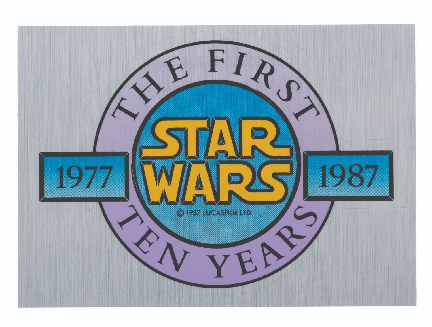 (Lucasfilm Ltd., 1987) A foil sticker celebrating the first ten years of "Star Wars." Measuring 3.75" x 5" the sticker is in very good condition with light wear from age.