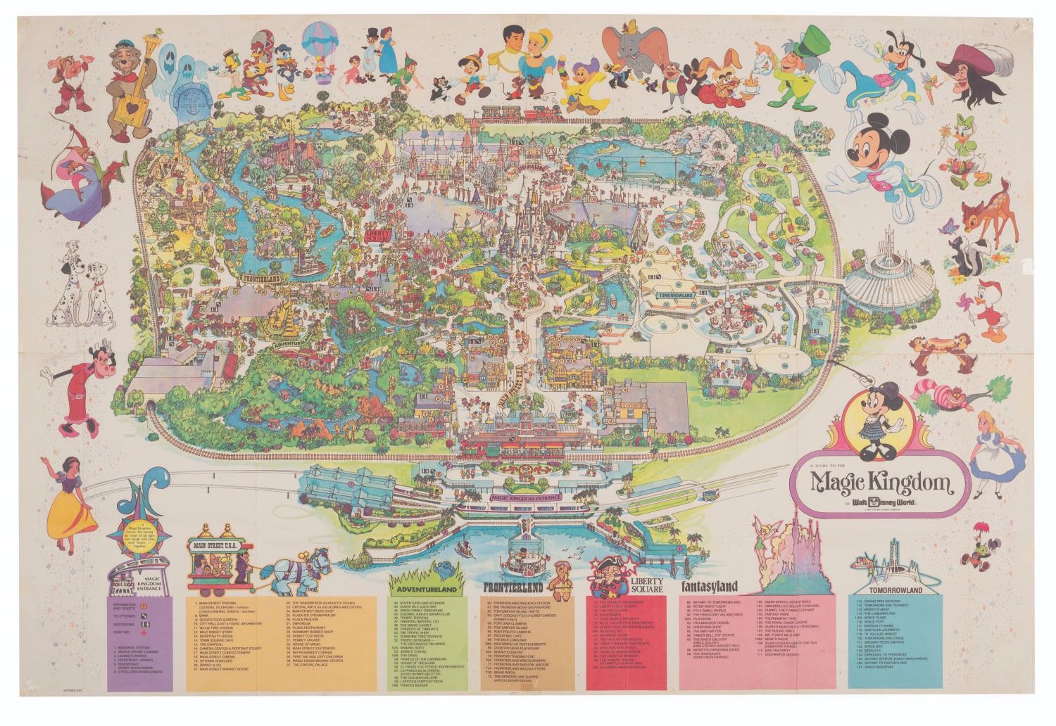 (Walt Disney World, 1987) An early "A Guide to the Magic Kingdom of Walt Disney World" souvenir map, framed by Disney characters and introduced by Walt Disney World Magic Kingdom Guided Tour Hostess Minnie Mouse. This edition is the last to include If You Had Wings, which was replaced by If You Could Fly in 1987. Measuring 31.5"x38", the map is in very good condition exhibiting tears along its original folds, tape retention and pinholes from the previous display, spots of soiling, creases, and wear throughout.