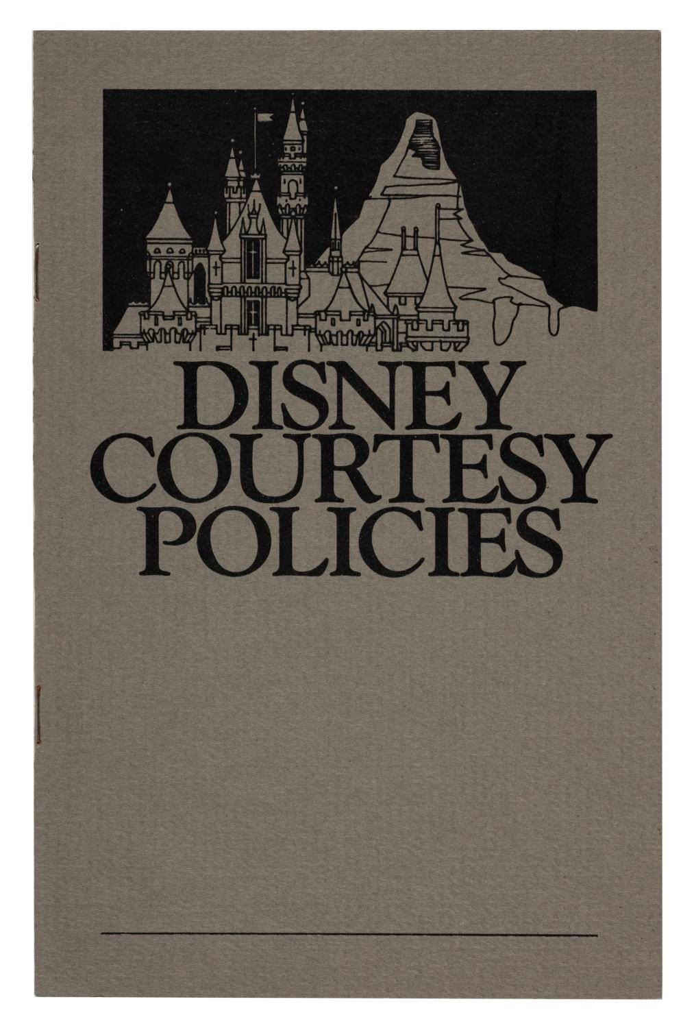 (Disneyland, 1988) A booklet describing Disney's courtesy policies for Cast Members. The booklet covers the basics of non-verbal and verbal communication, as well as on-stage presentation, and is designed to train Cast Members in the appropriate courtesy policies when dealing with guests. Measuring 5.5" x 8.5", the booklet is in very good condition with light handling wear, and some rusting to the staples.