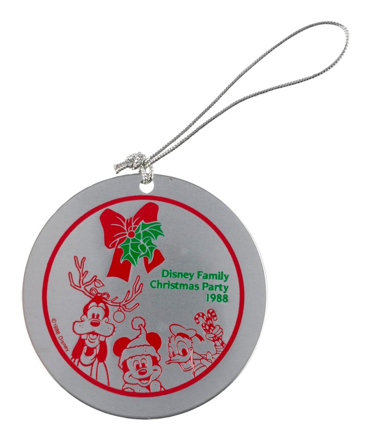 (Disneyland, 1988) A Cast Exclusive Disney Family Christmas Party ornament, given to employees at the 1988 holiday party at Disneyland. Measuring 2.75" in diameter, the aluminum ornament is in very good condition with light handling wear.