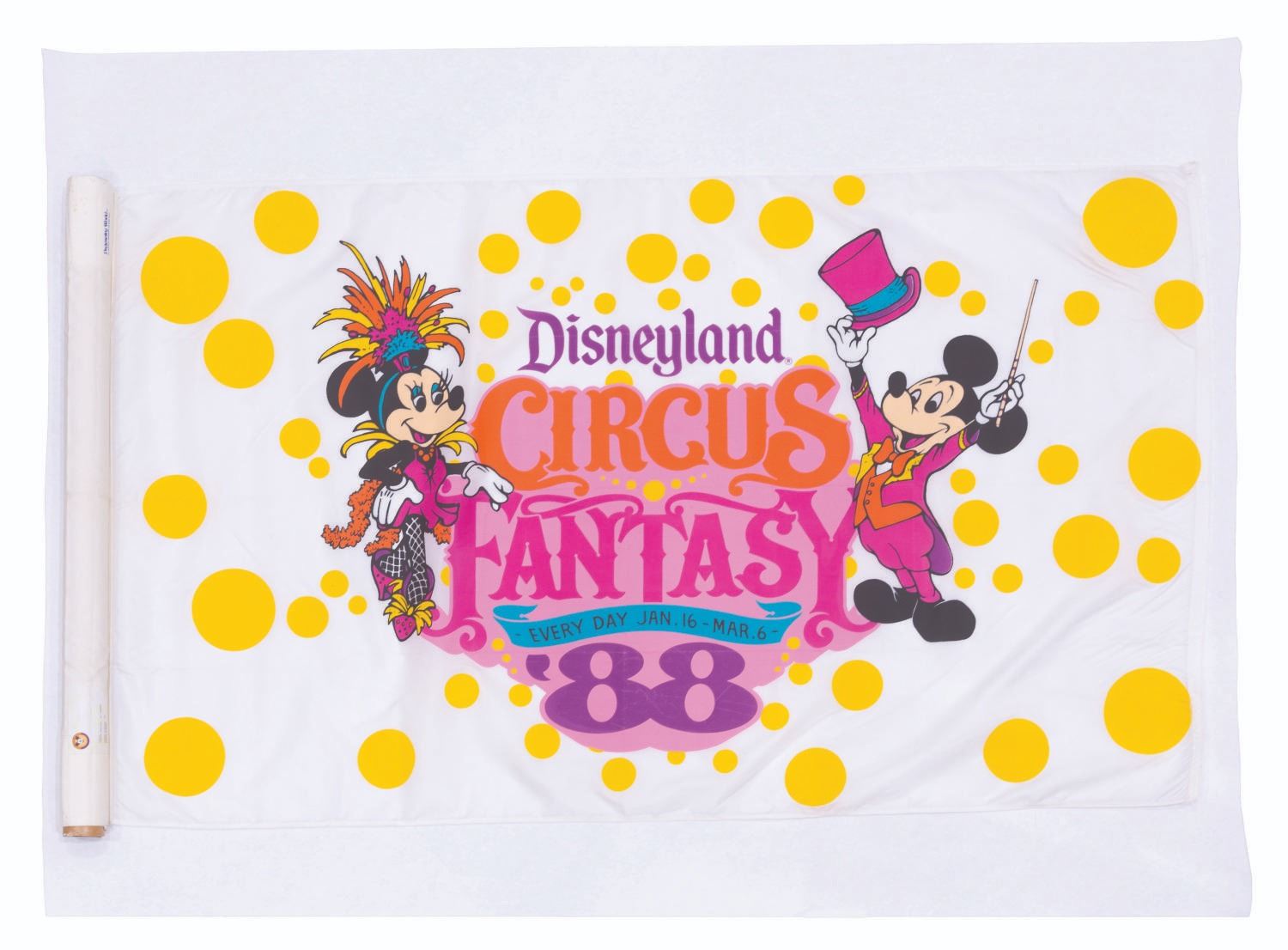 (Disneyland, 1988) A large double-sided flag for Disneyland's Circus Fantasy event, featuring Mickey and Minnie Mouse in circus attire. Measuring 35" x 60", the large silkscreened nylon flag displays in very good condition with wear from Park use, including scuffs, cracks, and light stains.
