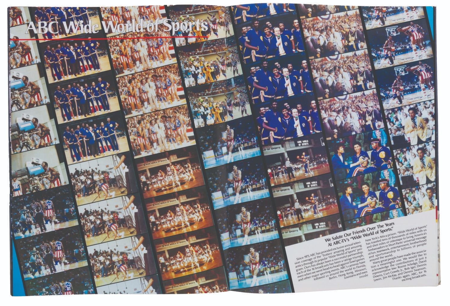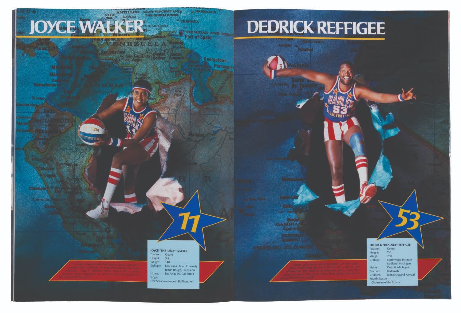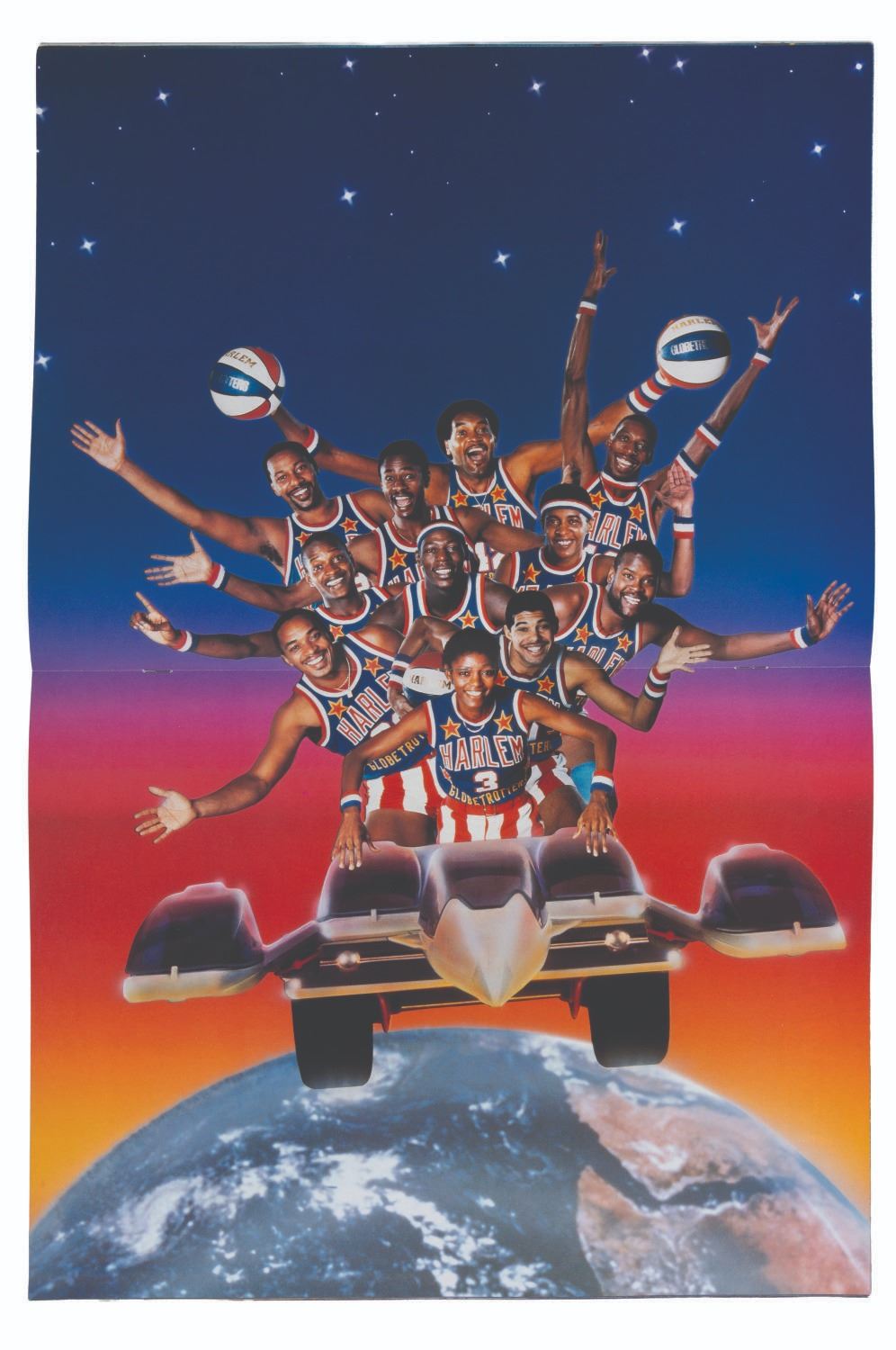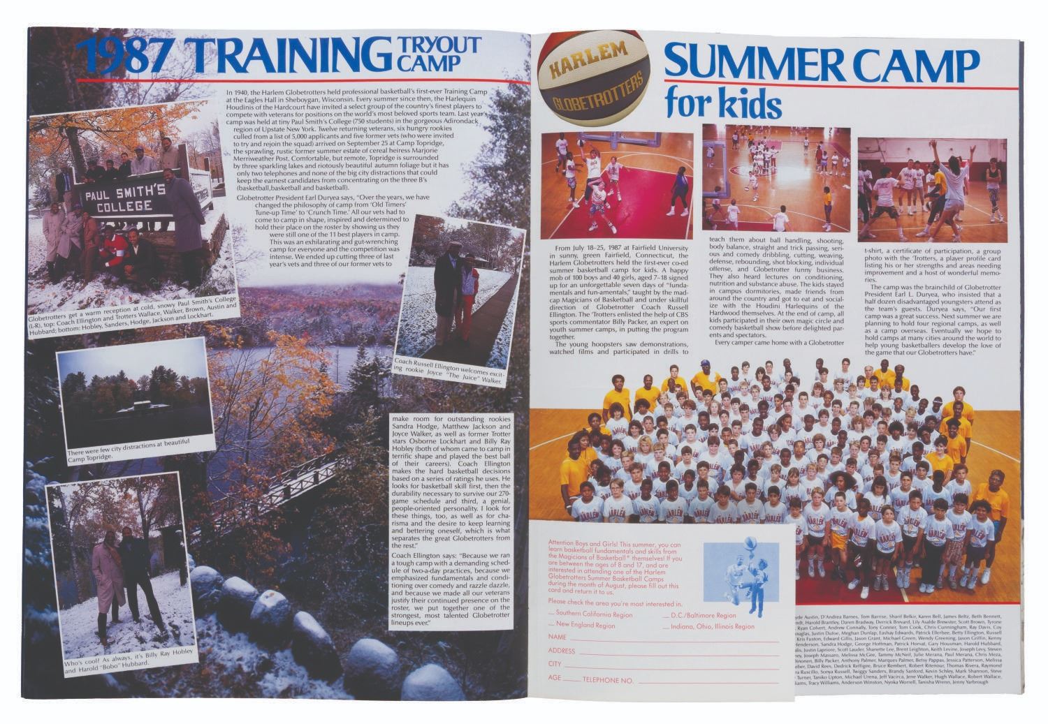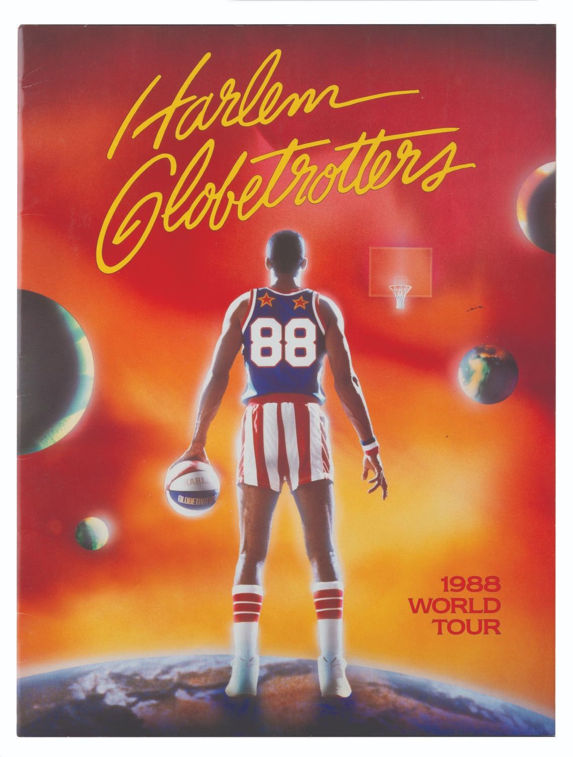 (Harlem Globetrotters, 1988) A program featuring colorful photos and player profiles from the Harlem Globetrotters' 1988 world tour. Measuring 11.5" x 15", the program is in good condition with creases, scuffs, a black mark on the cover, and wear.