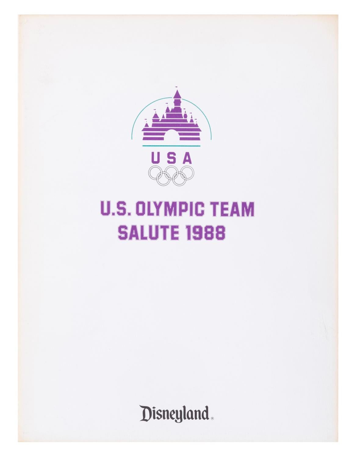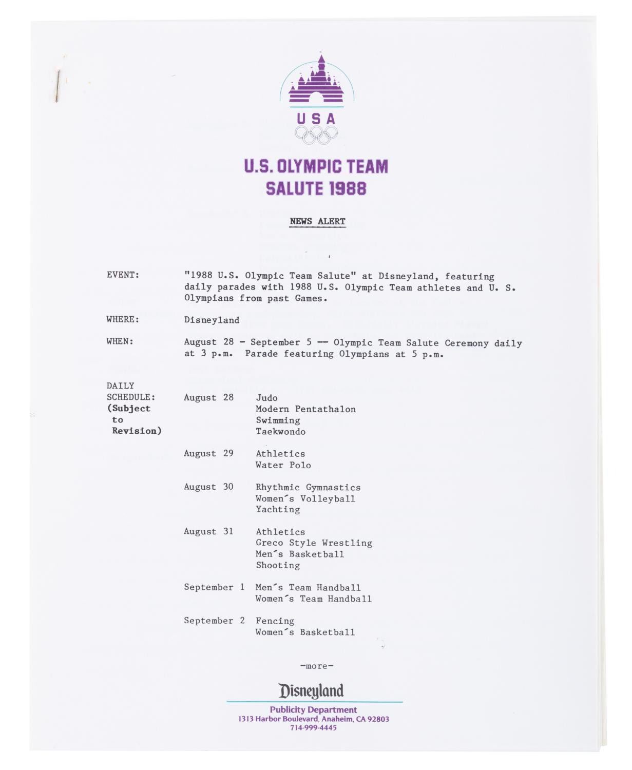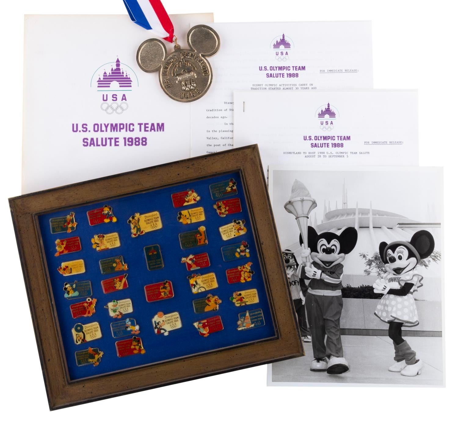 (Disneyland, 1988) A framed Olympics pin set commemorating Disney's sponsorship of the 1988 U.S. Olympic team, a medal given to Olympic athletes featured in a daily parade down Disneyland's Main Street, and a press kit for the events. The pins measure 1.25” to 1.5” in a 9.75” x 11.5” frame and are in fine condition. Measuring from the 3.5” x 4” medal to the 9” x 12” press kit, the items are in good to fine condition with edge wear, light smudges, and discoloration from age to the folder, and oxidation to the staples on the press releases.