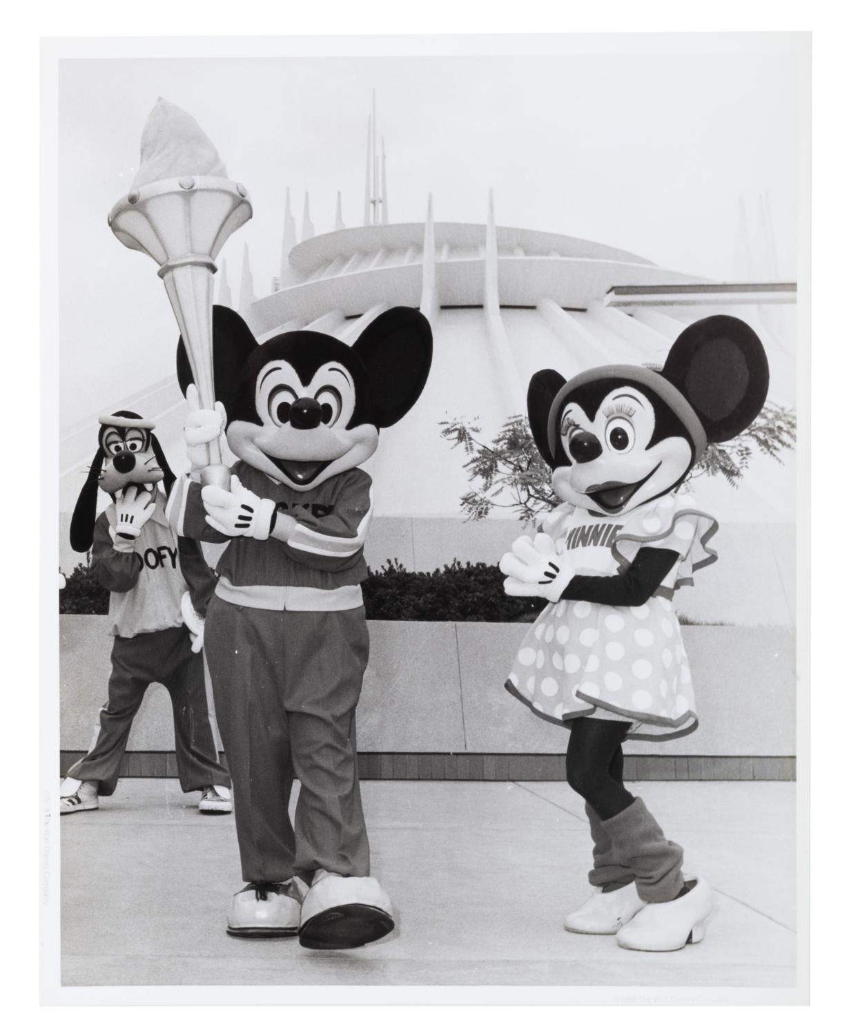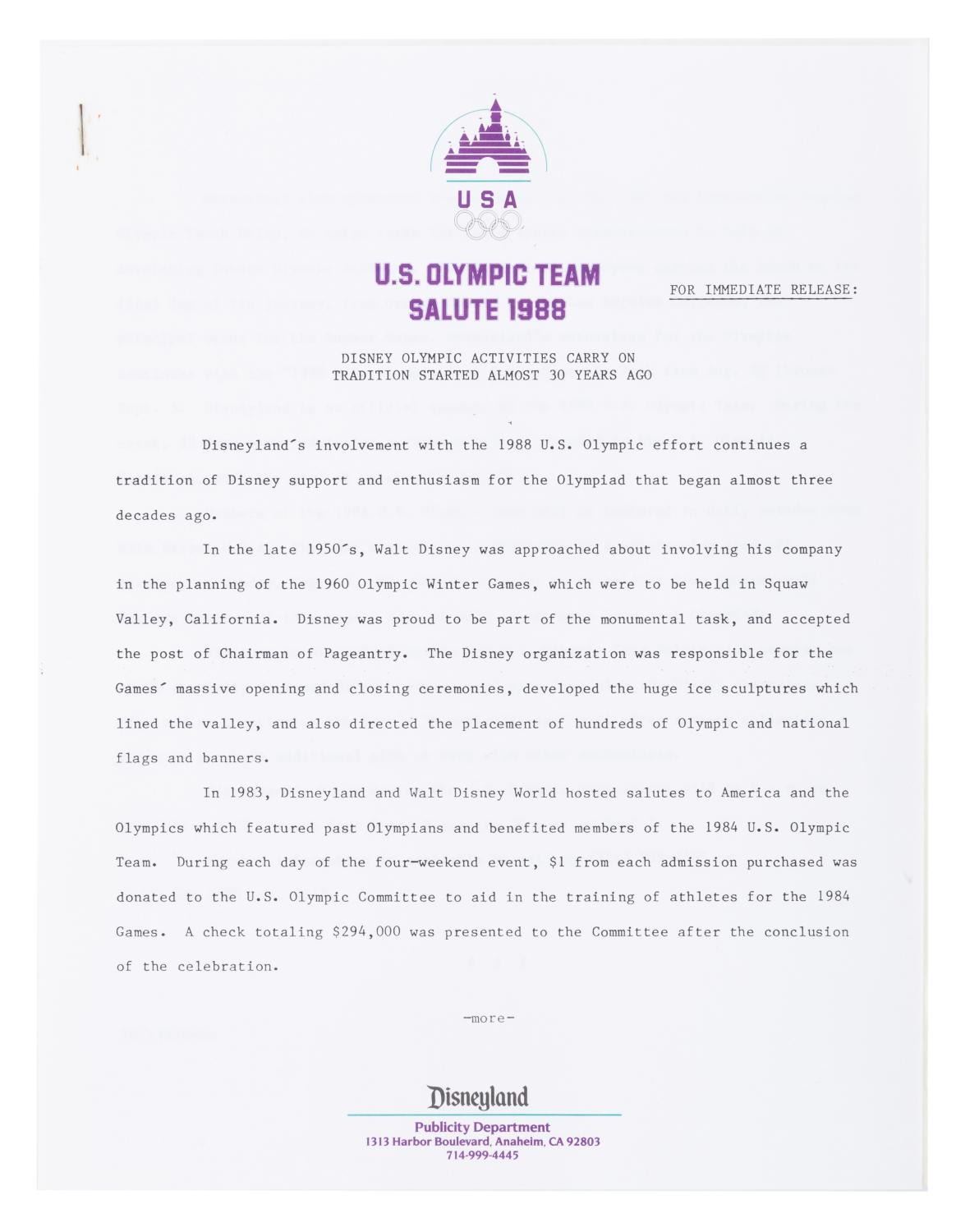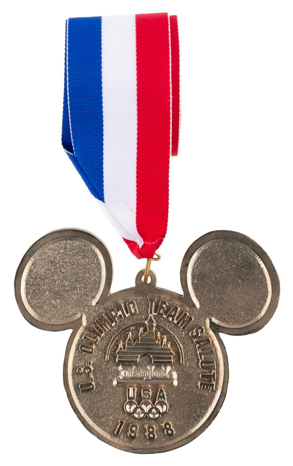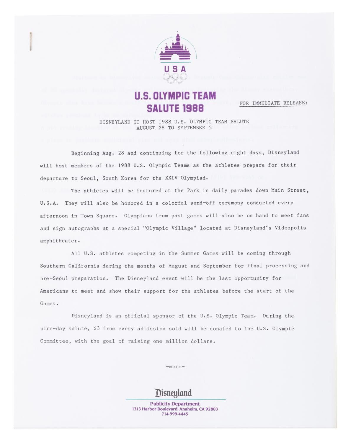 (Disneyland, 1988) A framed Olympics pin set commemorating Disney's sponsorship of the 1988 U.S. Olympic team, a medal given to Olympic athletes featured in a daily parade down Disneyland's Main Street, and a press kit for the events. The pins measure 1.25” to 1.5” in a 9.75” x 11.5” frame and are in fine condition. Measuring from the 3.5” x 4” medal to the 9” x 12” press kit, the items are in good to fine condition with edge wear, light smudges, and discoloration from age to the folder, and oxidation to the staples on the press releases.