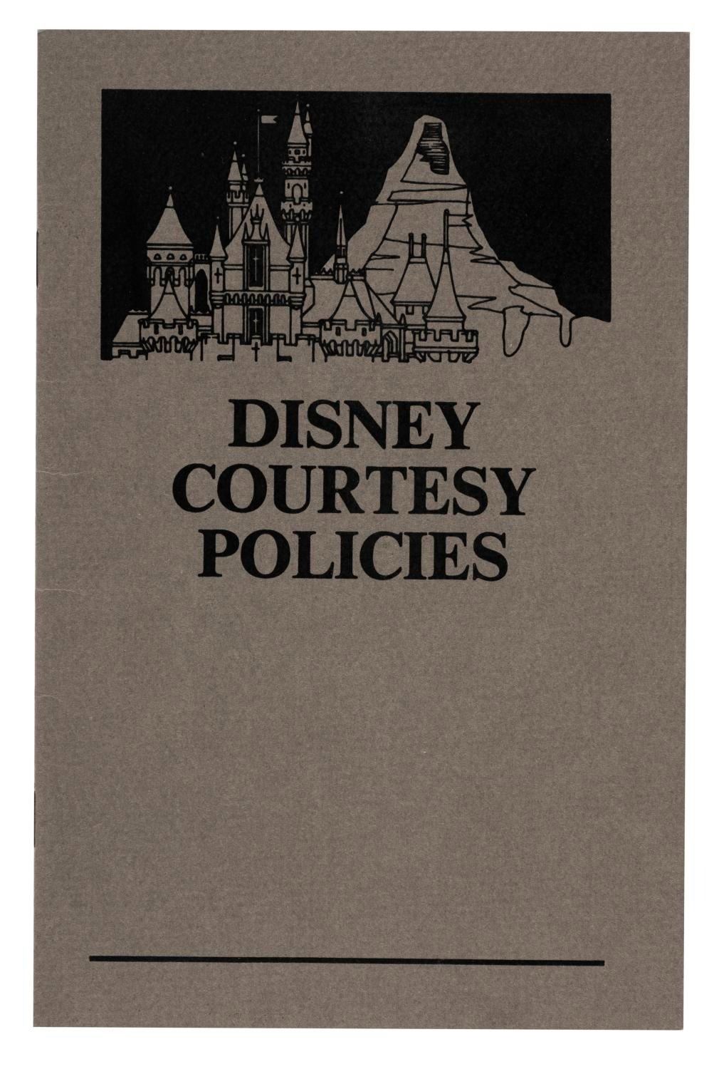 (Disneyland, 1989) A booklet describing Disney's Courtesy Policies for Cast Members. The booklet covers the basics of non-verbal and verbal communication, as well as on-stage presentation, and is designed to train Cast Members in the appropriate courtesy policies when dealing with Guests. Measuring 5.5" x 8.5", the booklet is in fine condition.