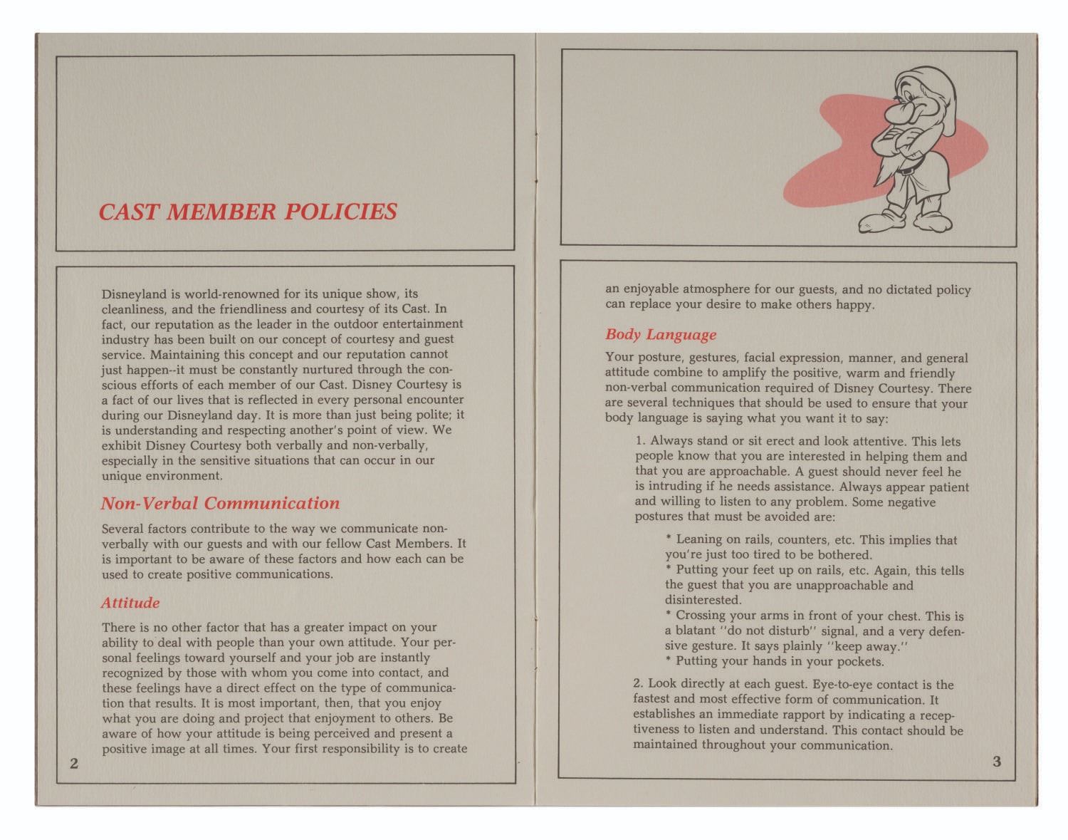 (Disneyland, 1989) A booklet describing Disney's Courtesy Policies for Cast Members. The booklet covers the basics of non-verbal and verbal communication, as well as on-stage presentation, and is designed to train Cast Members in the appropriate courtesy policies when dealing with guests. Measuring 8.5” x 5.5", the book is in very good condition, with faint scratches and light wear.
