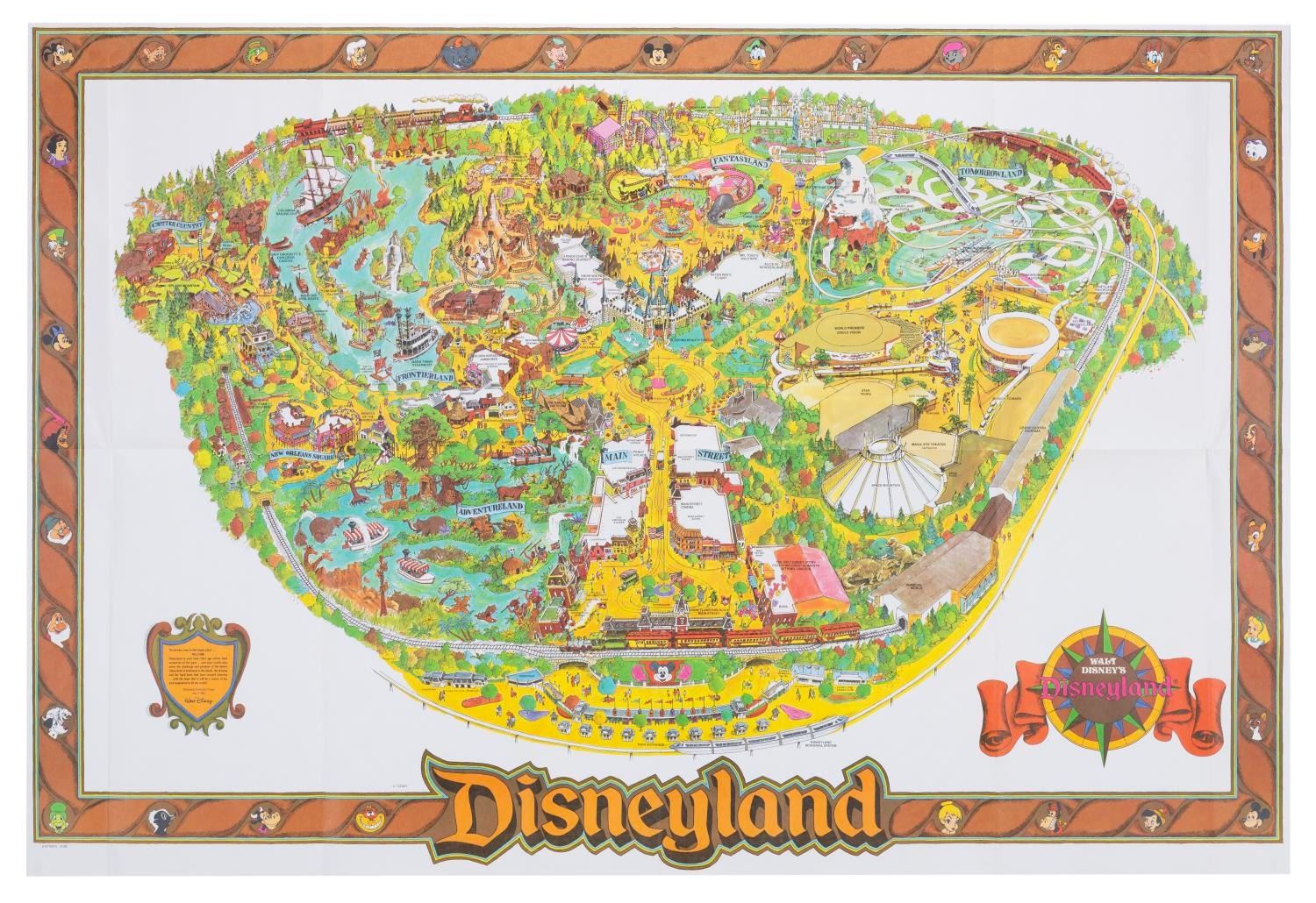 (Disneyland, 1989) A large souvenir map of Disneyland from 1989. This map is the first edition to omit America Sings, feature Splash Mountain, and detail the change from Bear Country to Critter Country. It is the last map of the third series of Disneyland maps. Measuring 30" x 43.5", the map is in very good condition with wear along the original folds.