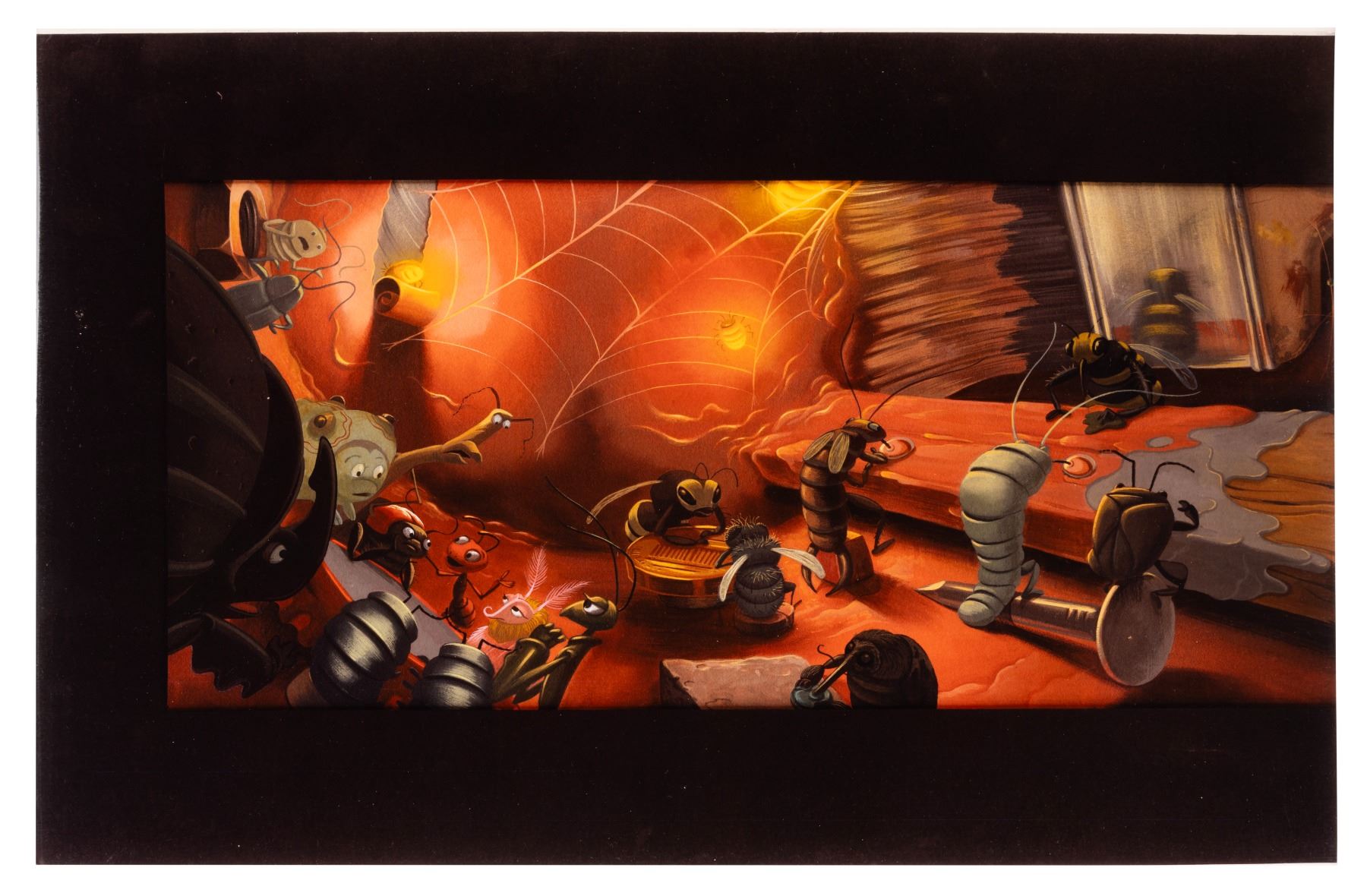 (Disney, 1990s) An original print of digital concept art from Pixar’s “A Bug's Life.” Featuring Flik and the circus bugs in a bar, the concept was created at the studio and printed in a limited quantity to be used during the development of the film and in pitch meetings. Measuring 11" x 17", the print displays in very good condition with light scratches and wear.