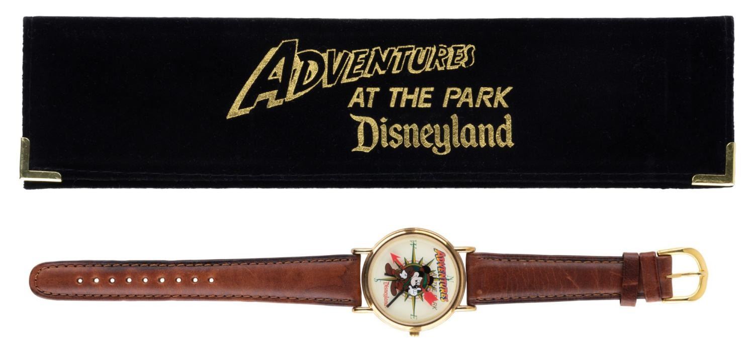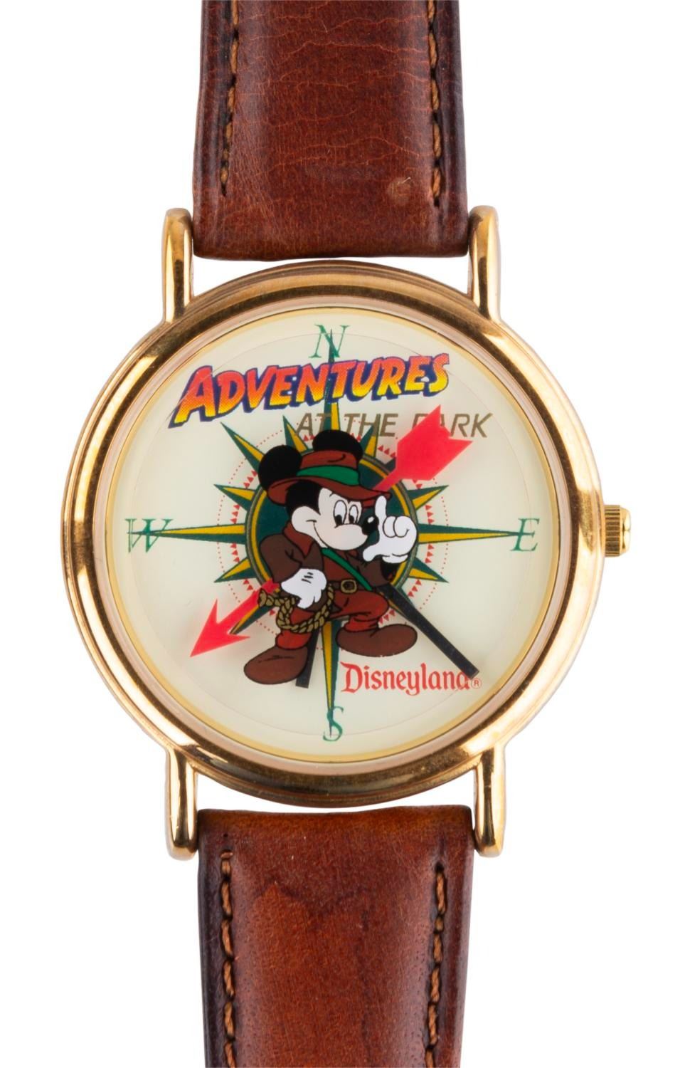 (Disneyland, 1990s) An “Adventures at the Park” Disneyland wristwatch featuring Mickey dressed as Indiana Jones, with a compass needle as a second hand. Released in a very limited edition of only 100, the men’s style watch numbered 021/100 is in fine unused condition requiring a battery to function.