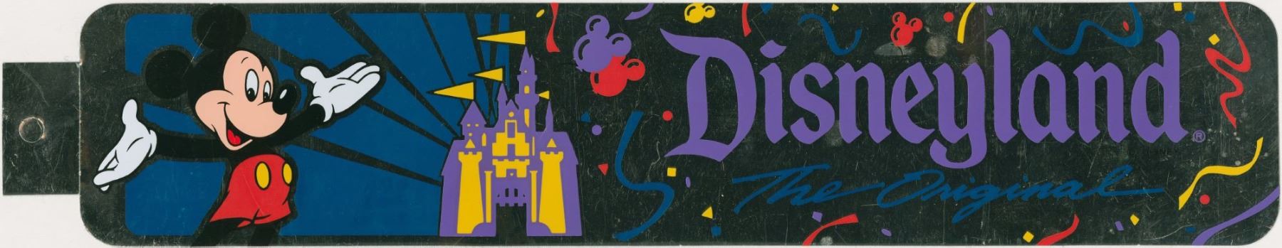 (Disneyland, 1990s) A Disneyland The Original foil bumper sticker featuring Mickey Mouse in front of Sleeping Beauty Castle. Measuring 2.5" x 14.5", the bumper sticker is in very good unused condition.