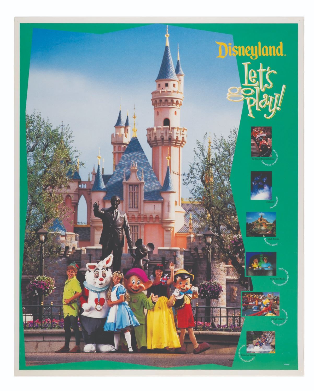 (Disneyland, 1990s) A promotional Disneyland "Let's Go Play" campaign poster featuring Disney Characters in front of the"Partners” statue and Sleeping Beauty Castle, with inset images of the Haunted Mansion, Fantasmic!, and other popular attractions. Measuring 15.5” x 19”, the poster is in very good condition, with light edge wear including pinholes at corners.