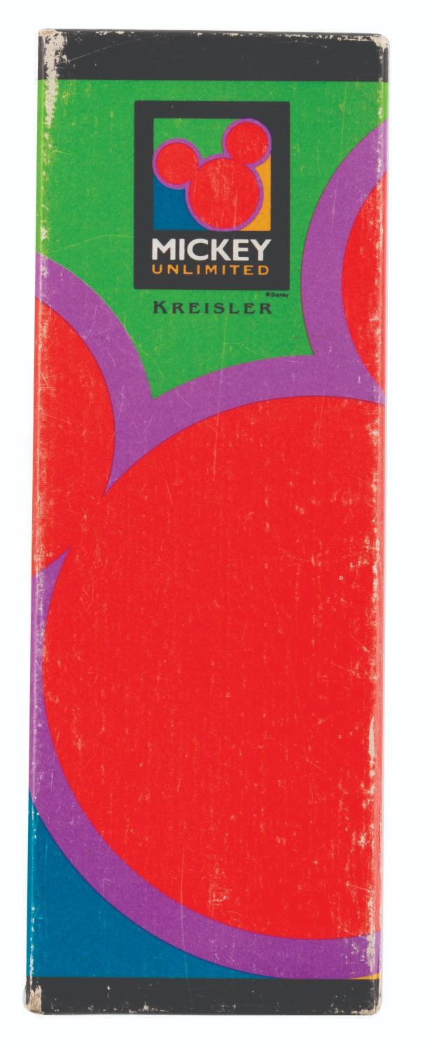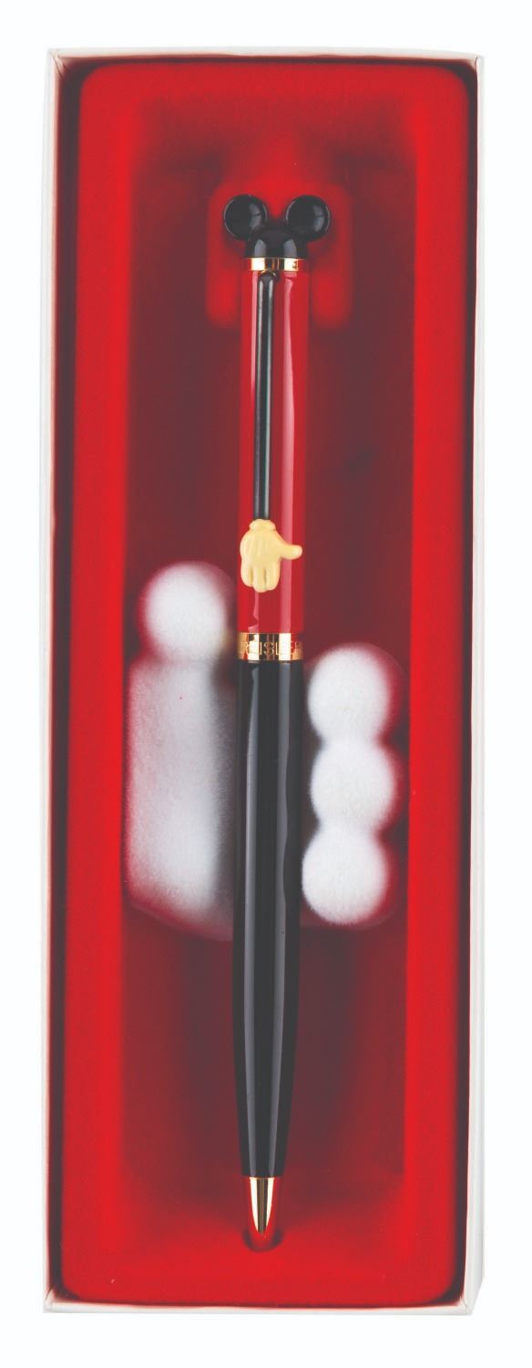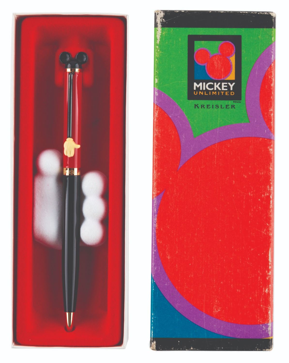 (Kreisler, 1995) A Mickey Unlimited figural ballpoint pen topped with Mickey ears with his signature glove on the clip. The pen is in fine working condition, with the box in fine condition on the inside, featuring the Mickey hand display, and fair condition on the outside, showing heavy wear.