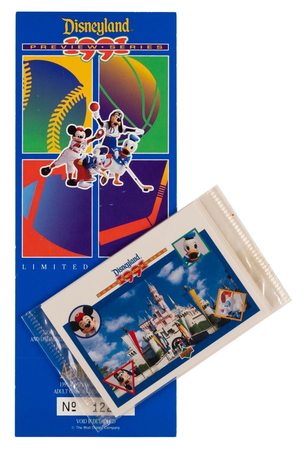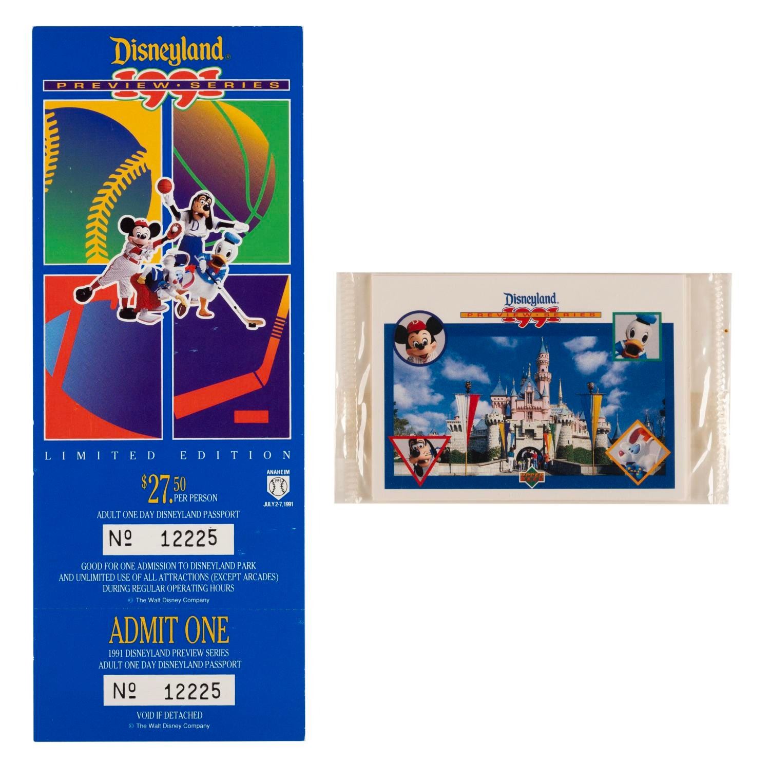 (Disneyland, 1991) A Cast Member passport and an unopened package of five trading cards. Measuring from 2.5" x 3.5" and 3" x 8", the items are in very good condition with light edge wear an scuffing to the passport.