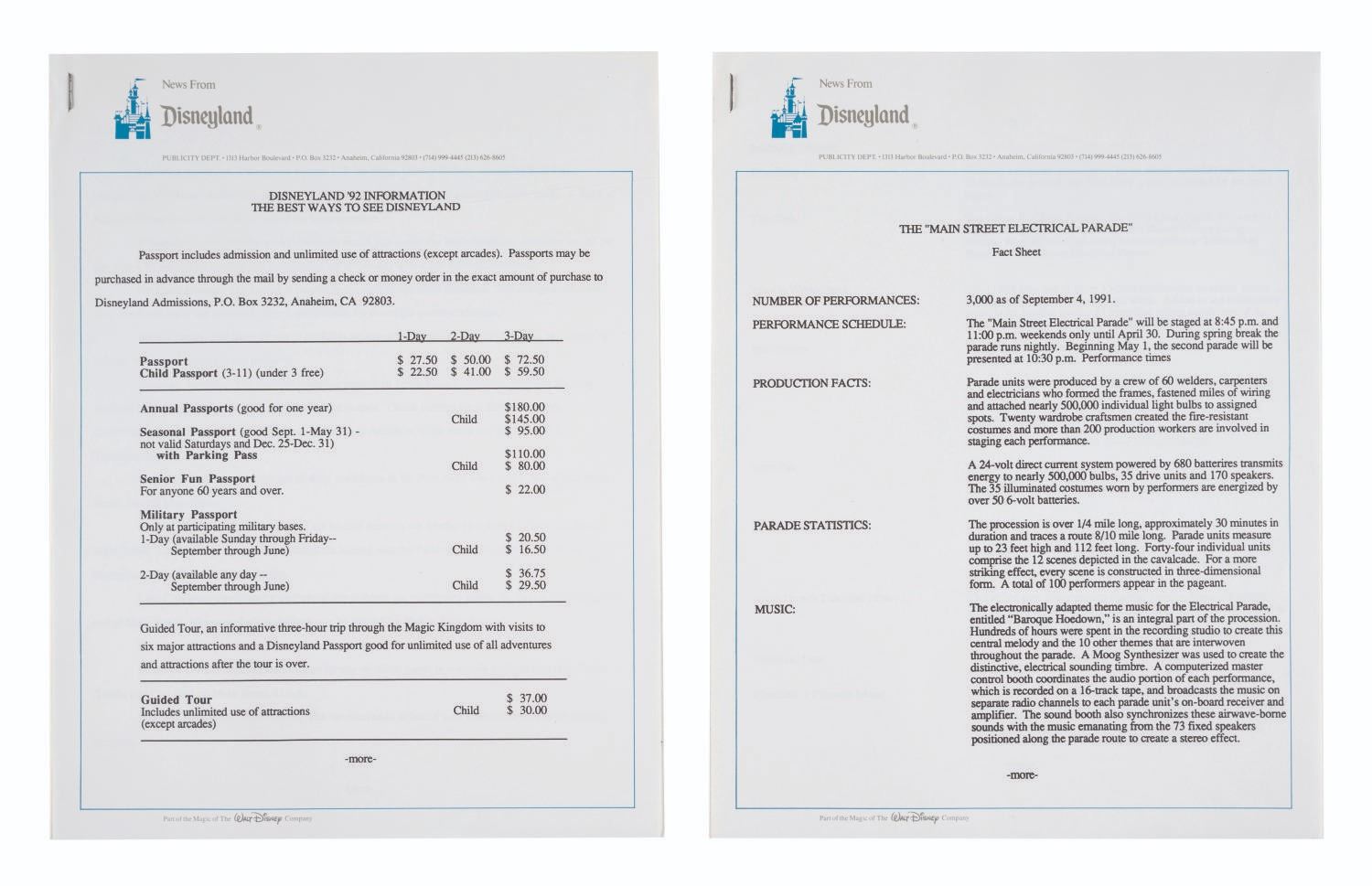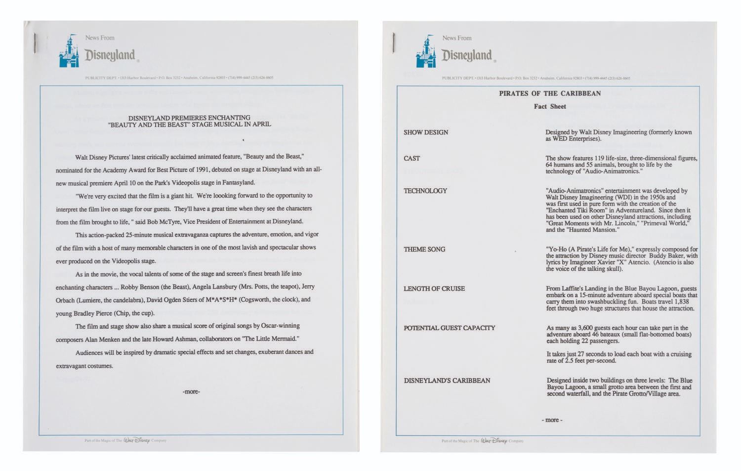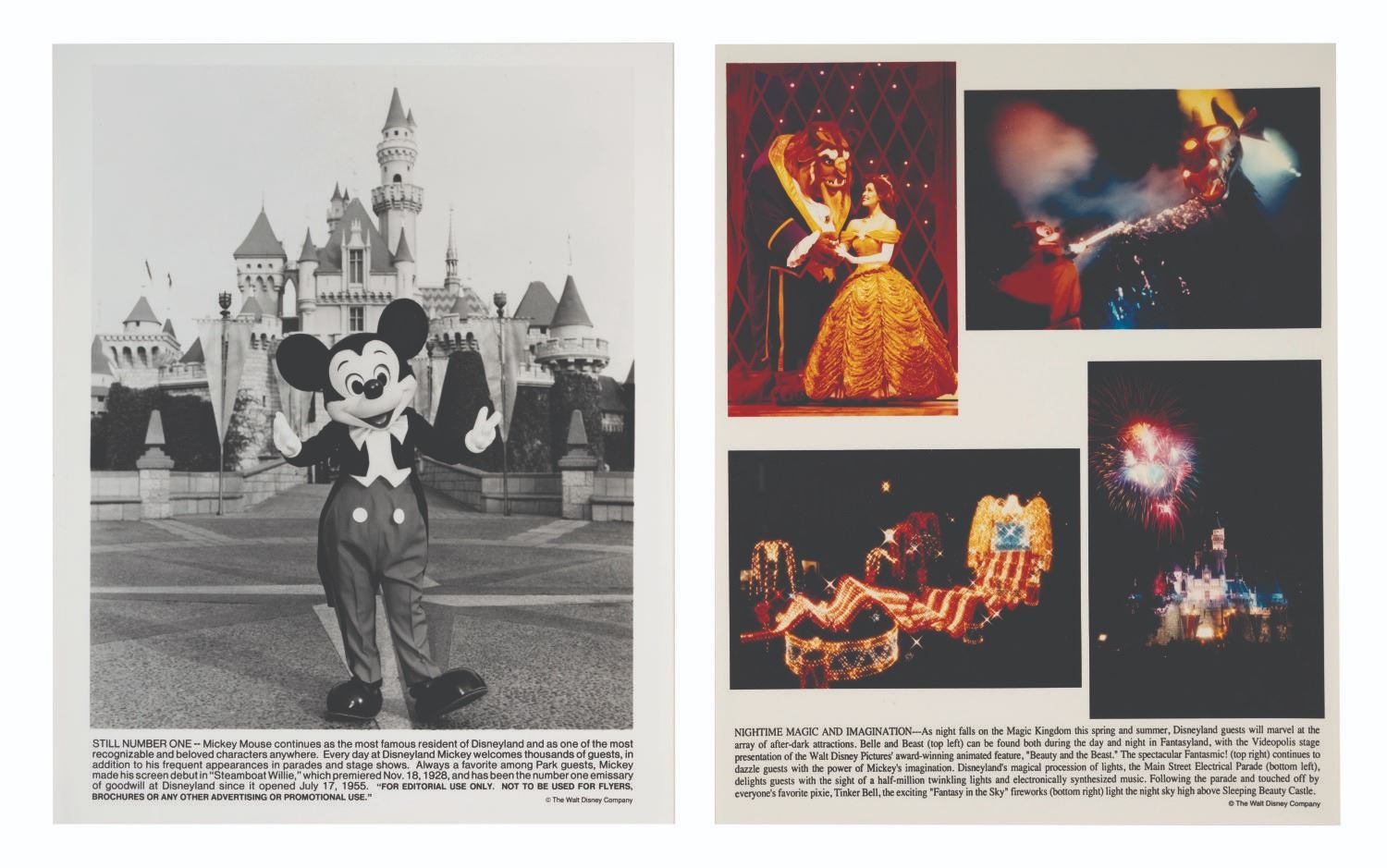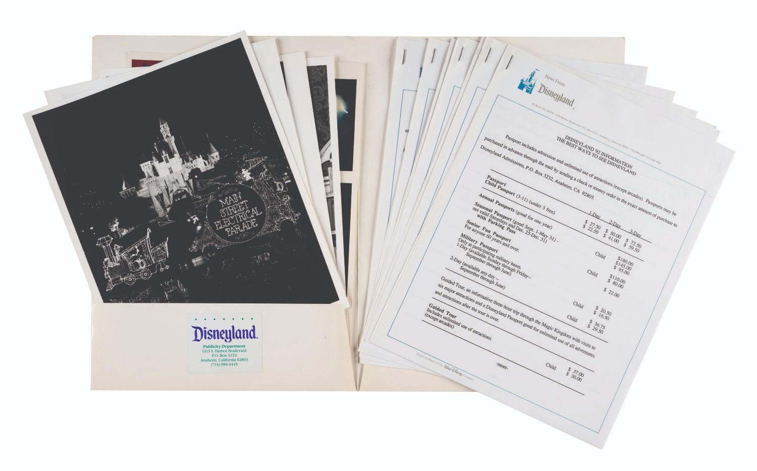 (Disneyland, 1991) A Disneyland Press Kit from 1991. This kit was prepared by the Disneyland Public Relations Department and contains (8) News From Disneyland press releases and (5) photos featuring Beauty and the Beast in Videopolis, Fantasmic!, Main Street Electrical Parade, and Fantasy in the Sky fireworks!. The materials come within a decorative 9"x12" folder and are in very good condition exhibiting a few folds, and minor wear.