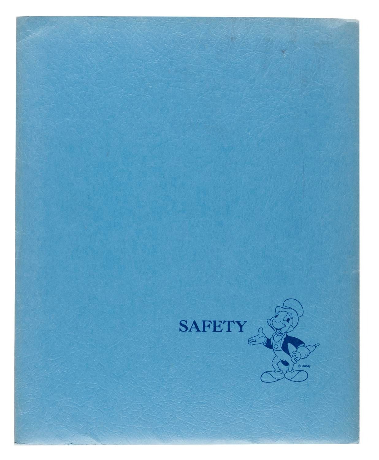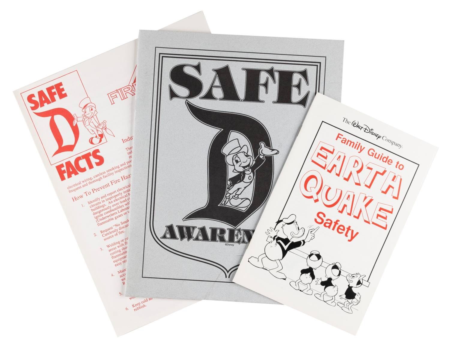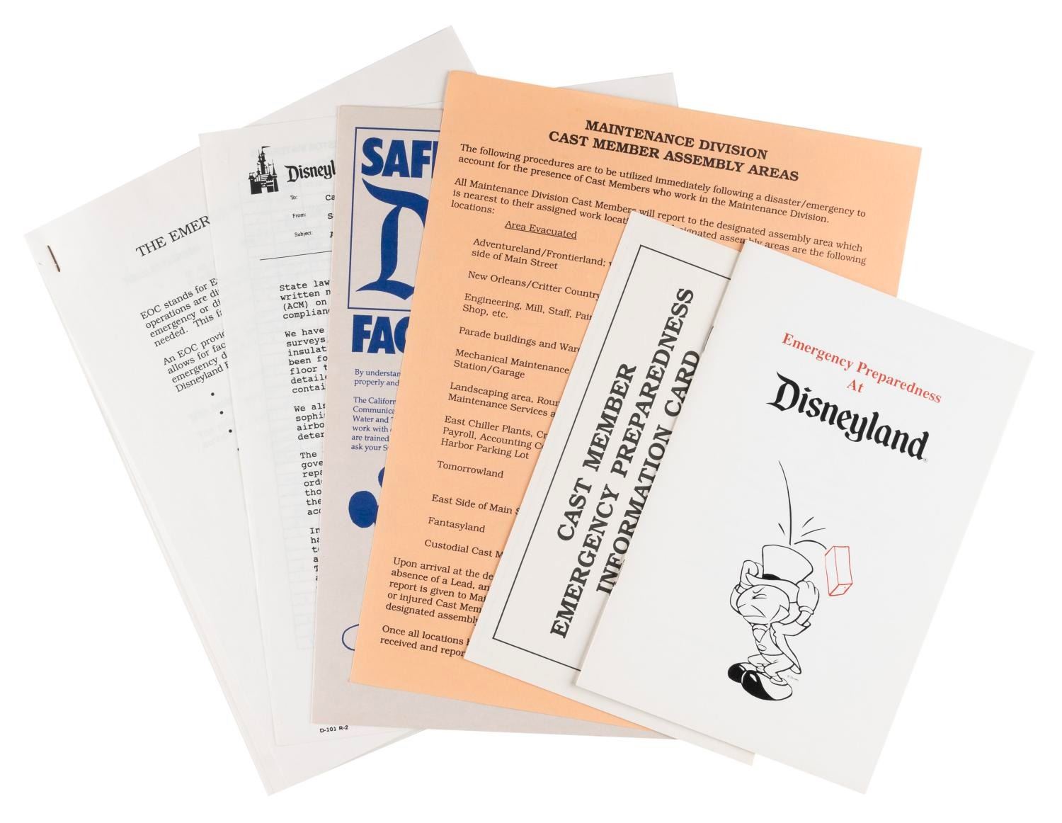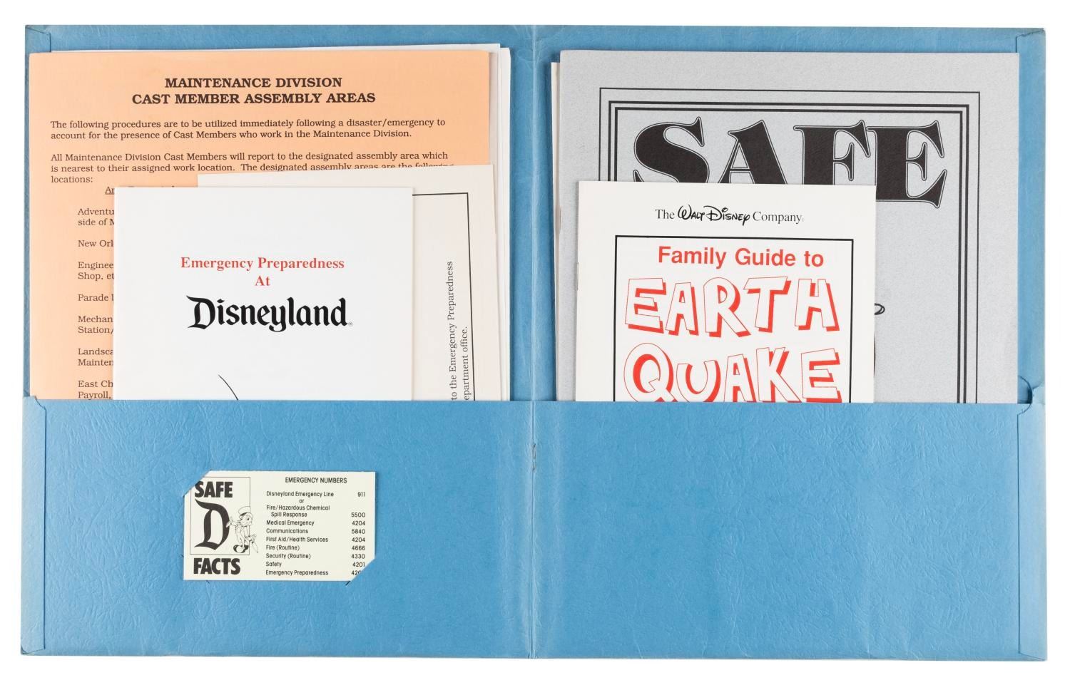 (Disneyland, 1991) A packet from a Disneyland Cast Member safety seminar, including brochures on Emergency Preparedness at the Park, Earthquake Safety, First Aid and Accident Prevention, and related documents. Measuring 9.5" x 11.75", the packet is in very good condition with light creases, scratches, wear, and discoloration from age.