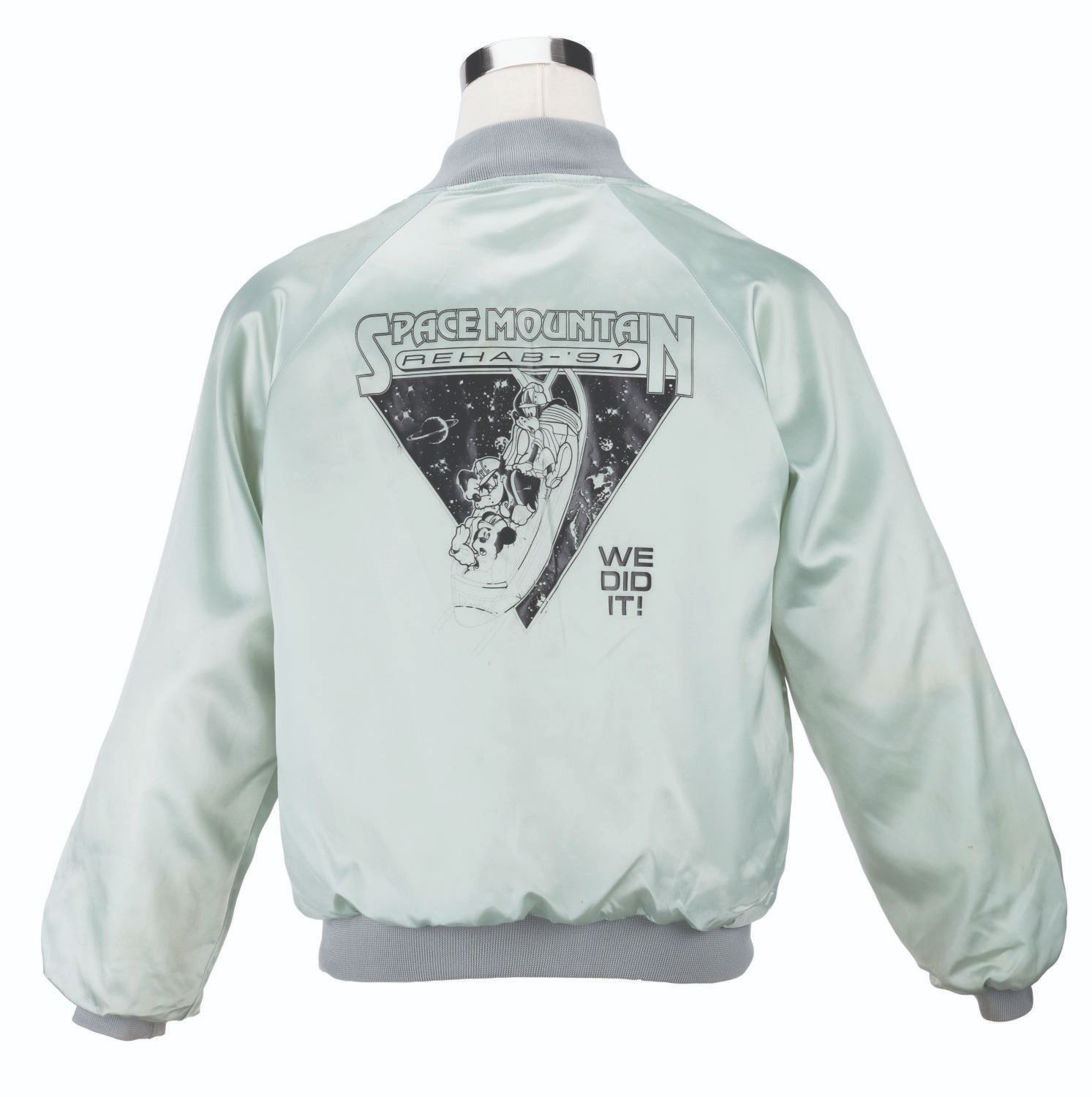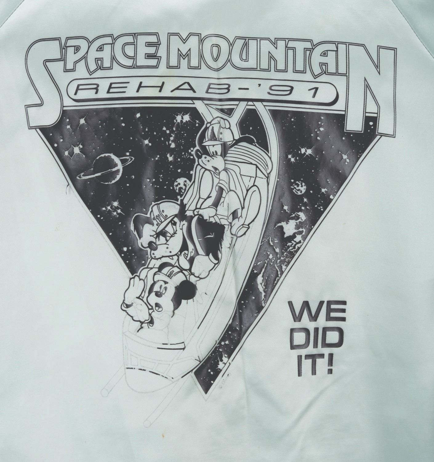 (Walt Disney World, 1991) A silver shell jacket given to Cast Members who worked on a 1991 refurbishment of Space Mountain. Labeled a size Large 42-44, the jacket is in good condition with stains, wear, and heavy fading on the reverse design.