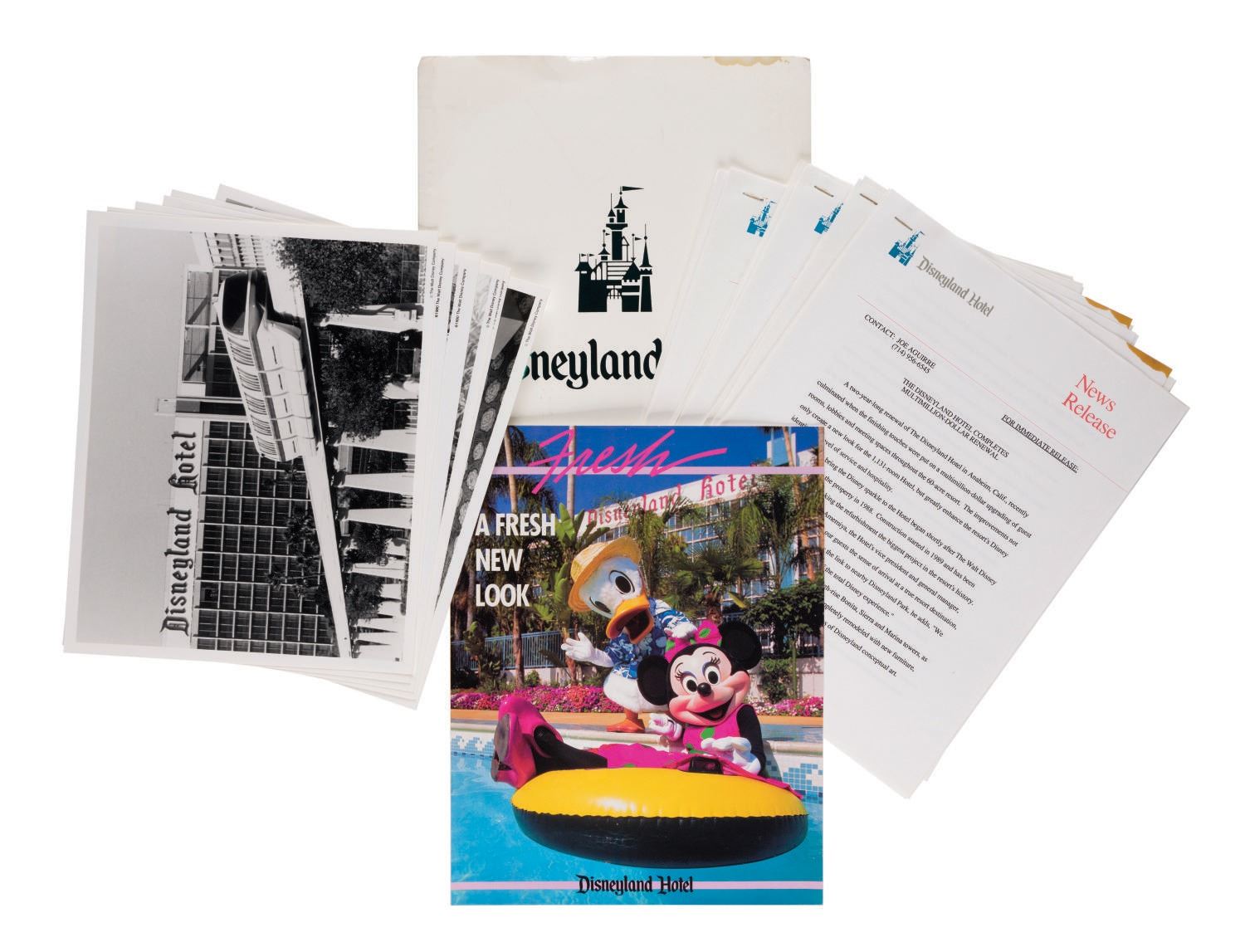 (Disneyland Hotel, 1992) A press kit announcing expansions of the Disneyland Hotel. The folder and contents were prepared for media members and include News Releases and facts about the multimillion-dollar renewal of the hotel. Additionally (6) promotional photos and "A Fresh New Look" brochure are included. Measuring 9"x12", the folder and contents are in very good condition.