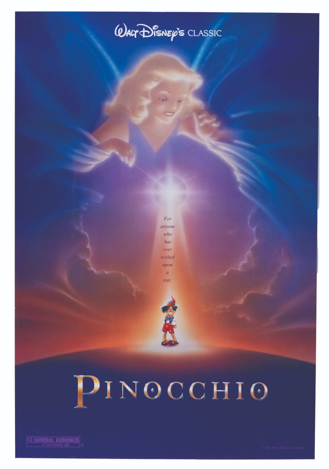 (Disney, 1992) An original one-sheet poster for the 1992 re-release of "Pinocchio," designed by John Alvin. Measuring 27" x 40", the poster is in good condition with creases, scratches, and a line down the center.