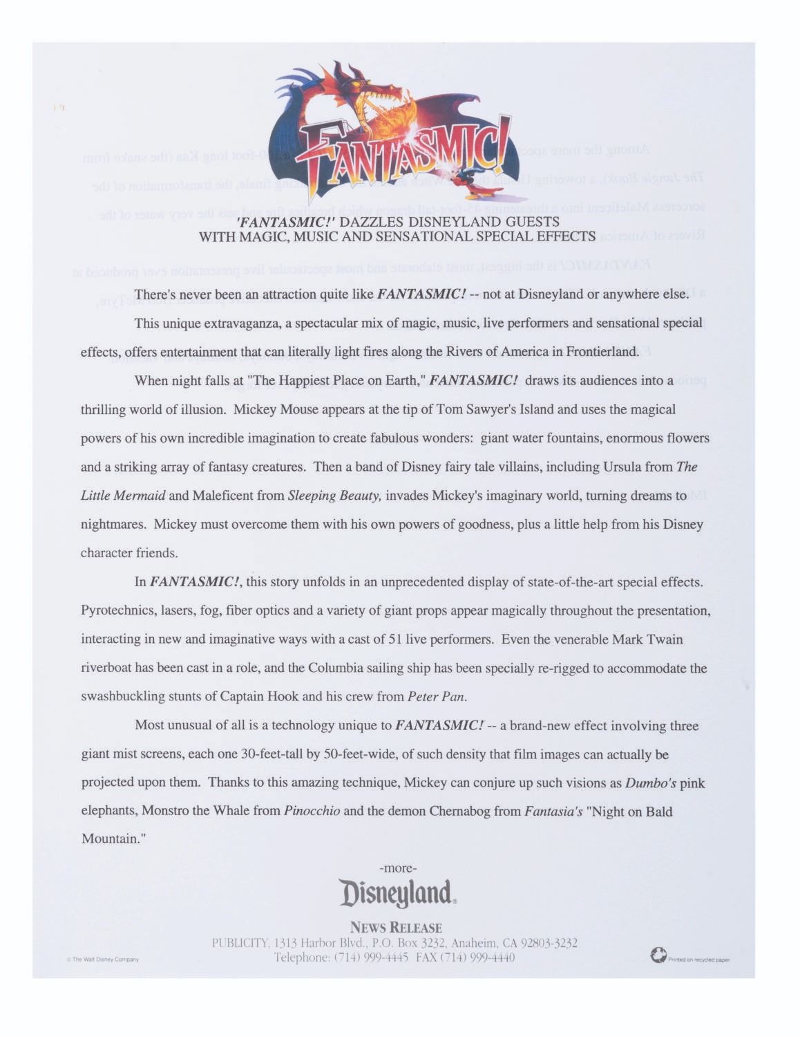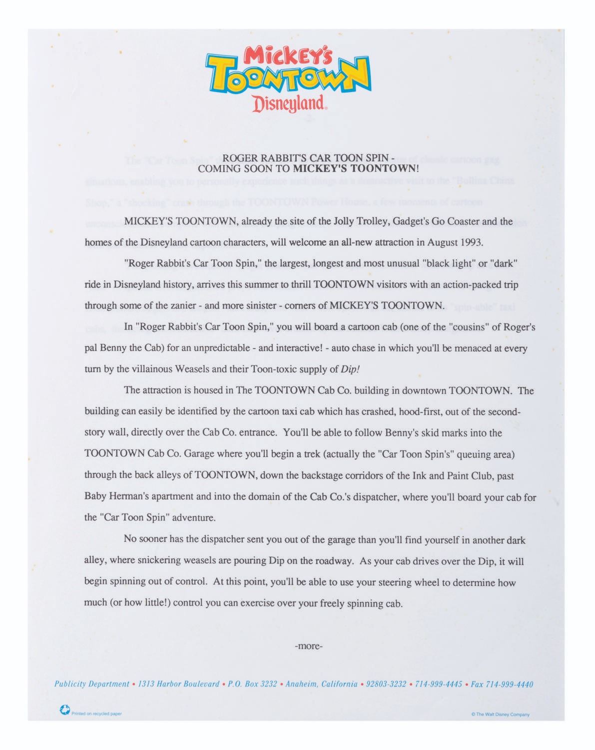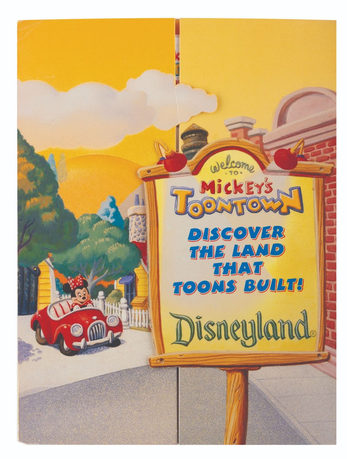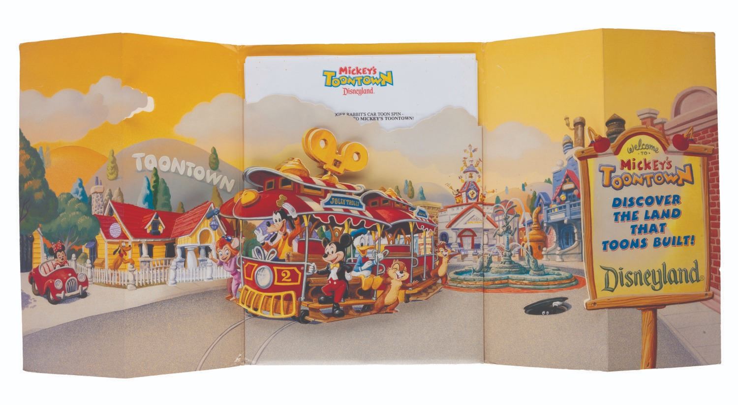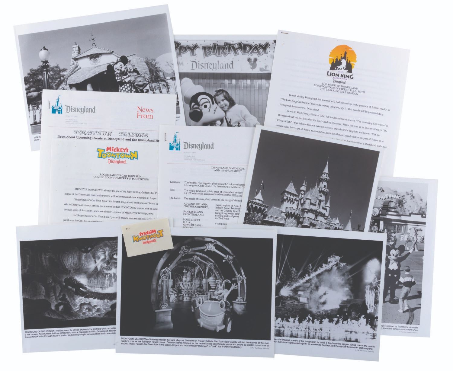 (Disneyland, 1993) A Disneyland press kit announcing the grand opening of Toontown, with releases about Fantasmic!, the upcoming Indiana Jones Adventure, the Lion King Celebration, and other news about the Park. The kit includes a pop-out folder depicting the Jolly Trolly, eight 8" x 10" publicity photos, and ten stapled press releases. Measuring 12" x 9" the kit is in very good condition, with edge wear including creases to the folder, and slight wear to the releases including oxidation to the staples.