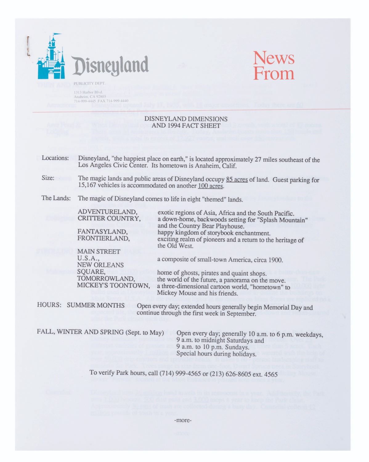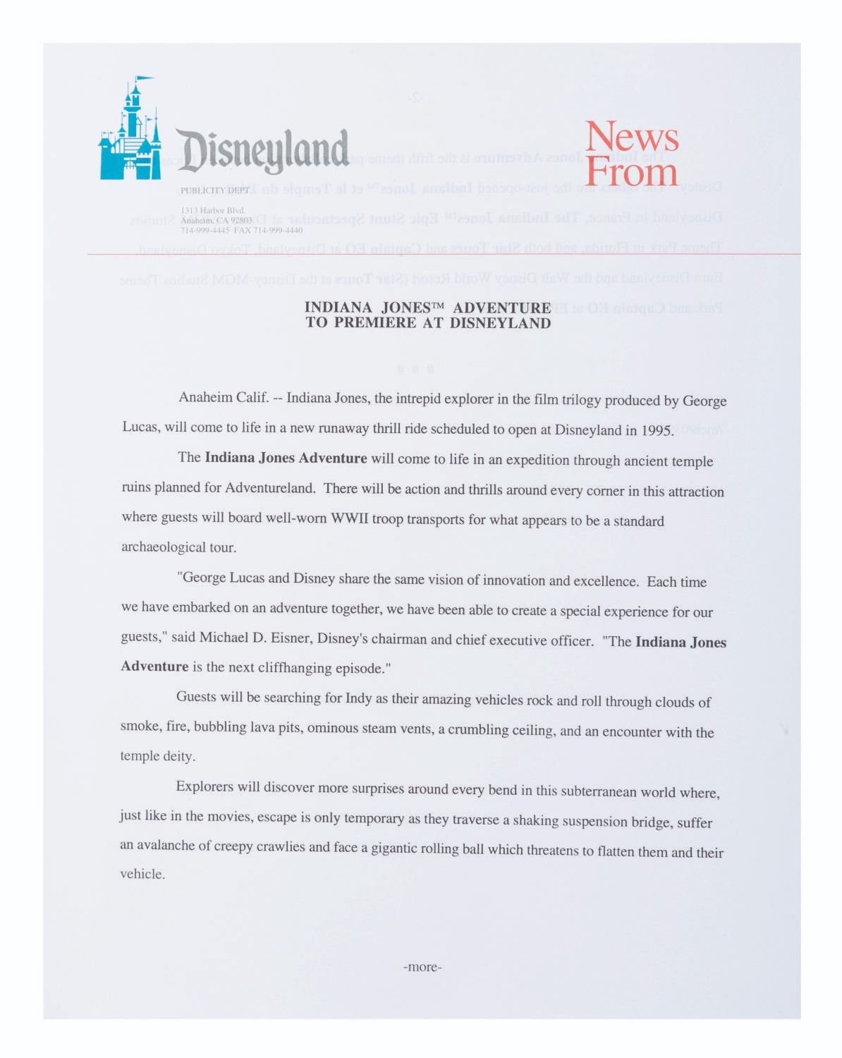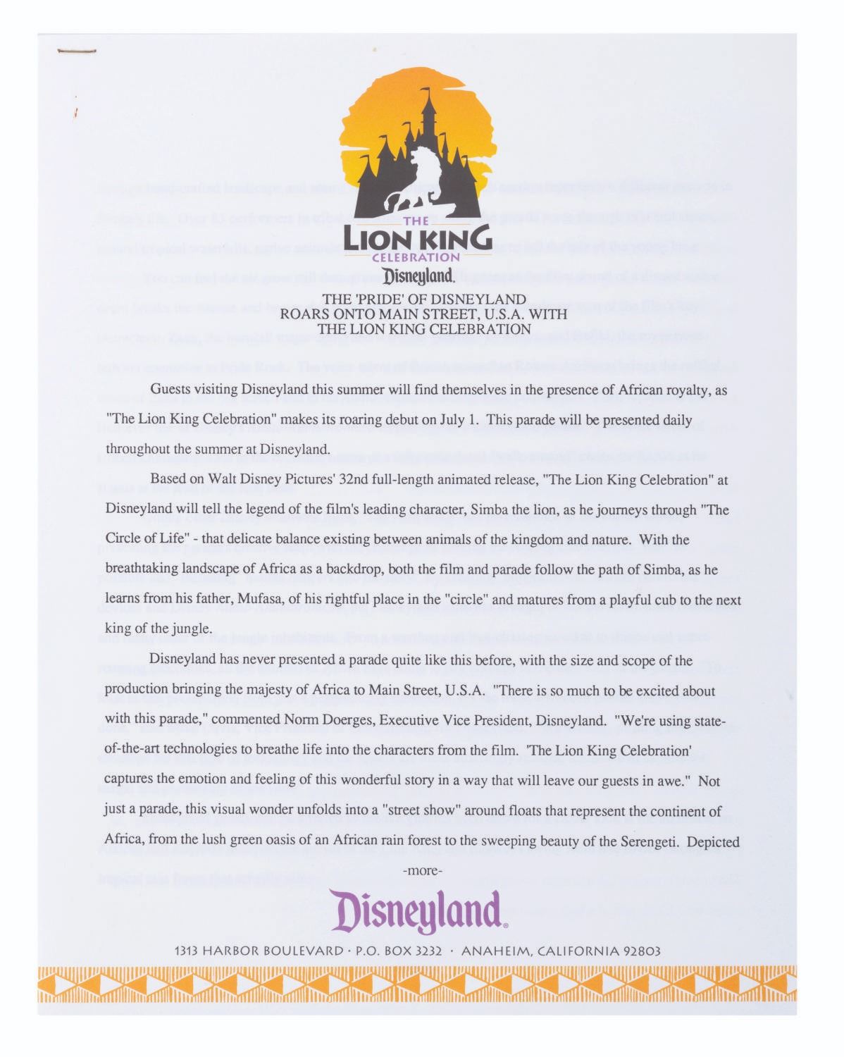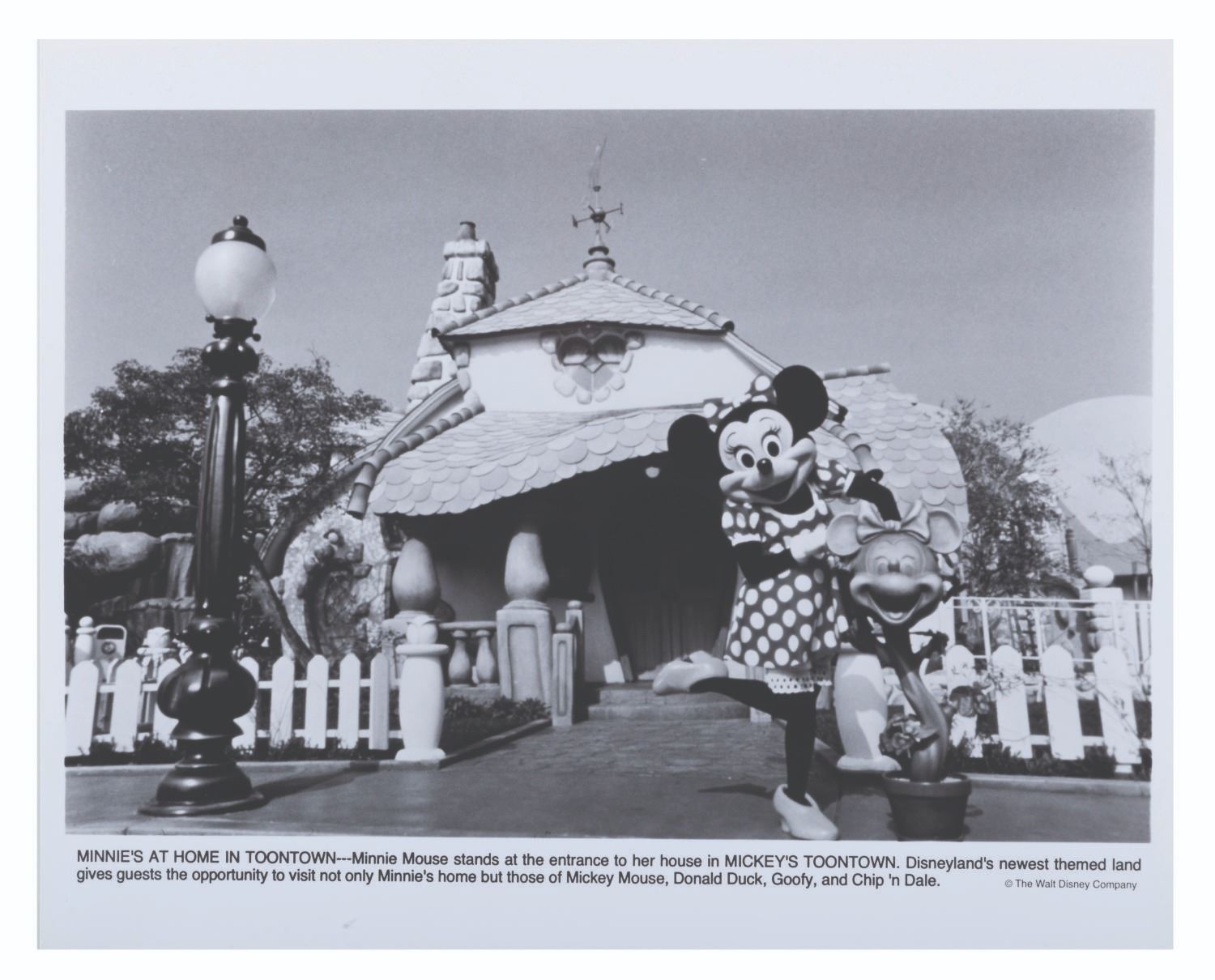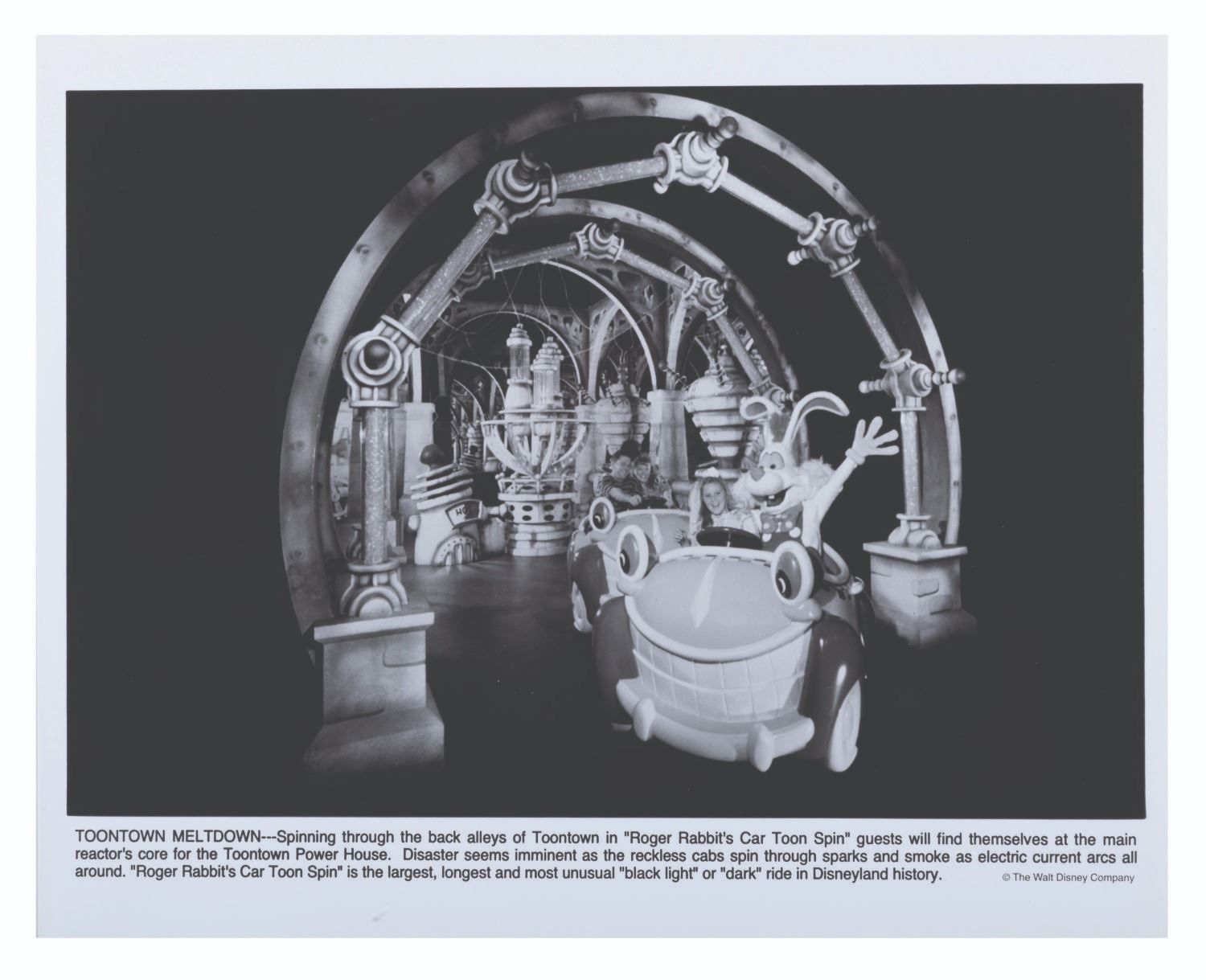 (Disneyland, 1993) A Disneyland press kit announcing the grand opening of Toontown, with releases about Fantasmic!, the upcoming Indiana Jones Adventure, the Lion King Celebration, and other news about the Park. The kit includes a pop-out folder depicting the Jolly Trolly, eight 8" x 10" publicity photos, and ten stapled press releases. Measuring 12" x 9" the kit is in very good condition, with edge wear including creases to the folder, and slight wear to the releases including oxidation to the staples.