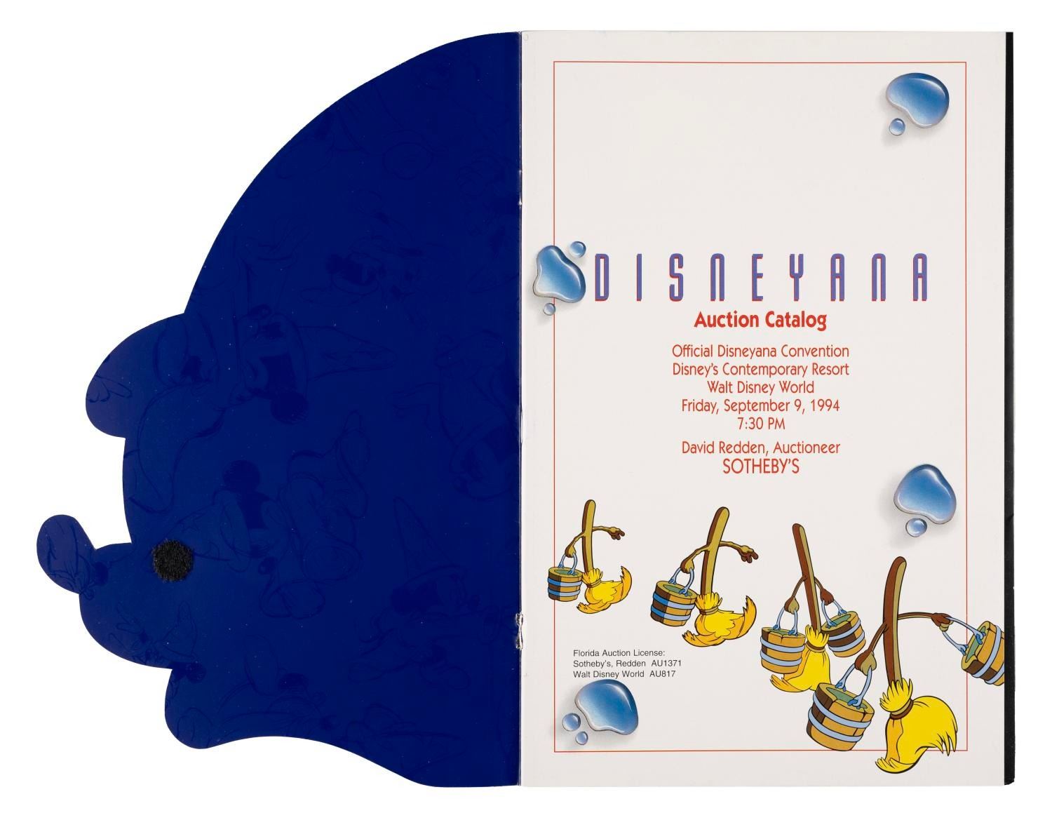 (Disneyana, 1994) A Disneyana Auction Catalog introducing the featured lots. Measuring 11" x 7", this envelope with cards is in good condition with creases along its spine and minor wear.