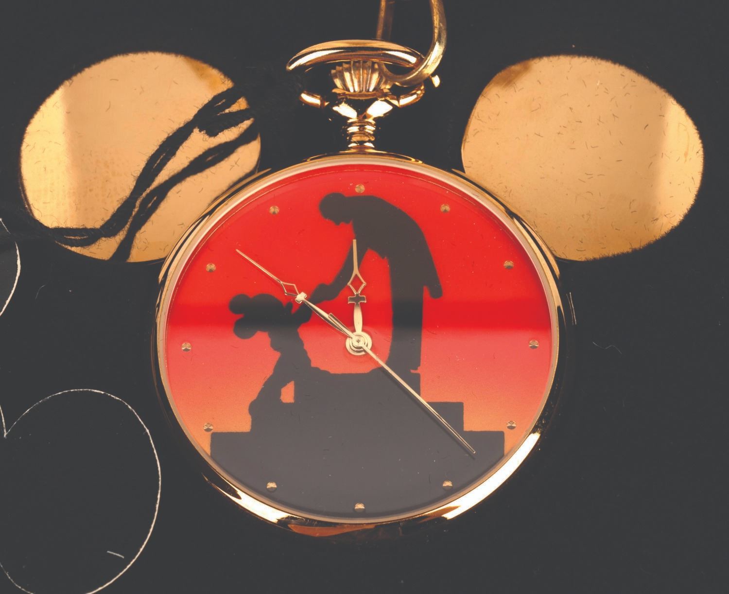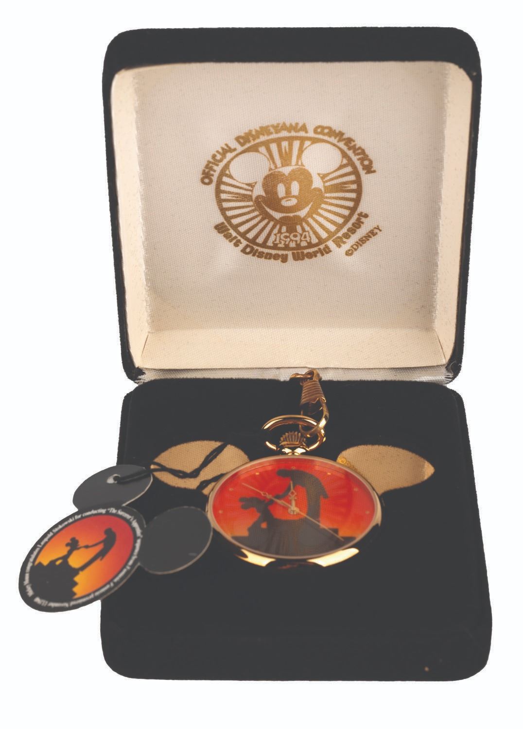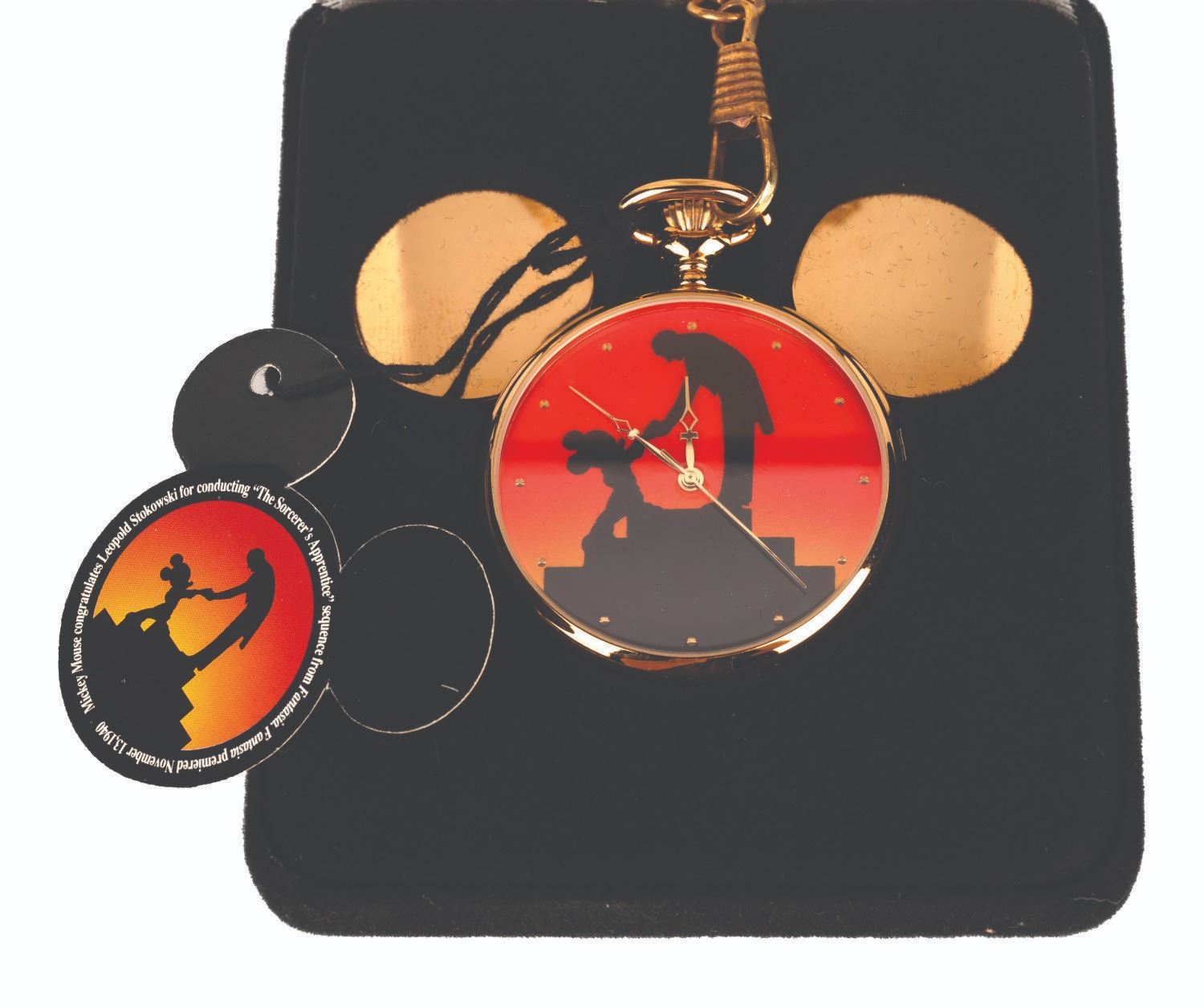 (Disneyana, 1994) A Walt Disney World Official Disneyana Convention-exclusive pocket watch featuring a silhouette of Leopold Stokowski and Mickey Mouse from Walt Disney’s “Fantasia.” The Majestron analog quartz watch was released in a limited edition of 2,200 and comes with the original black velvet case.