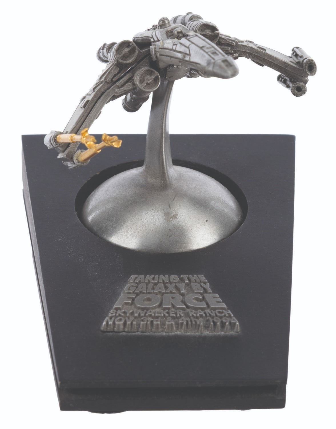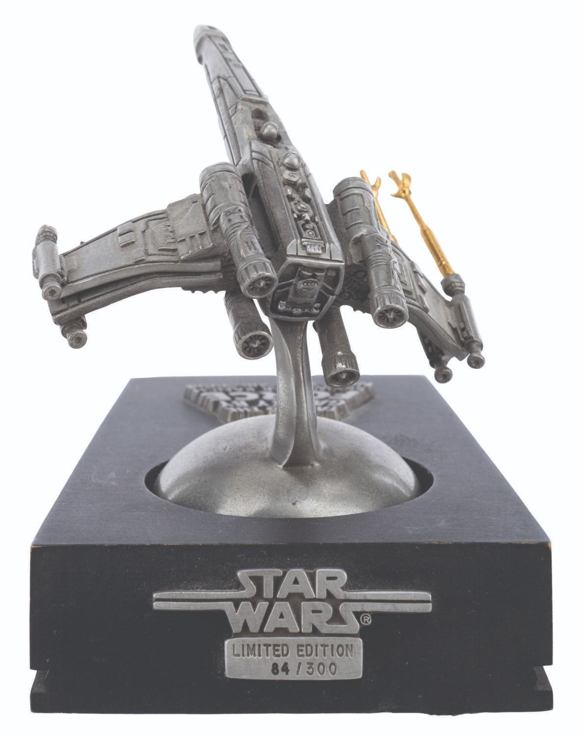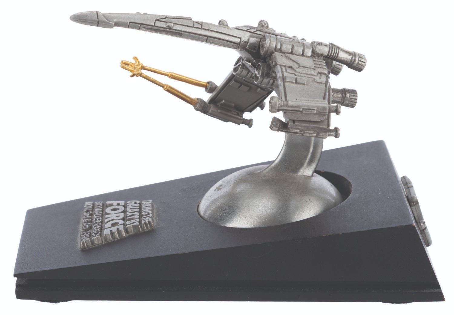 (Lucasfilm, 1994) A rare X-wing sculpture sent as an invitation to the 1994 Star Wars Summit at Skywalker Ranch. This 1994 meeting of licensees and staff is where George Lucas discussed plans for the Star Wars Special Editions and the prequel trilogy. Created in a limited edition, this sculpture is numbered 84/300. Measuring 3" x 4.5" x 3.25" tall, the sculpture is in very good condition with wear, a loose laser cannon, and two laser cannons missing.