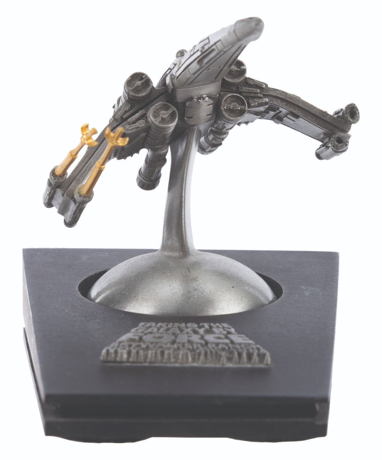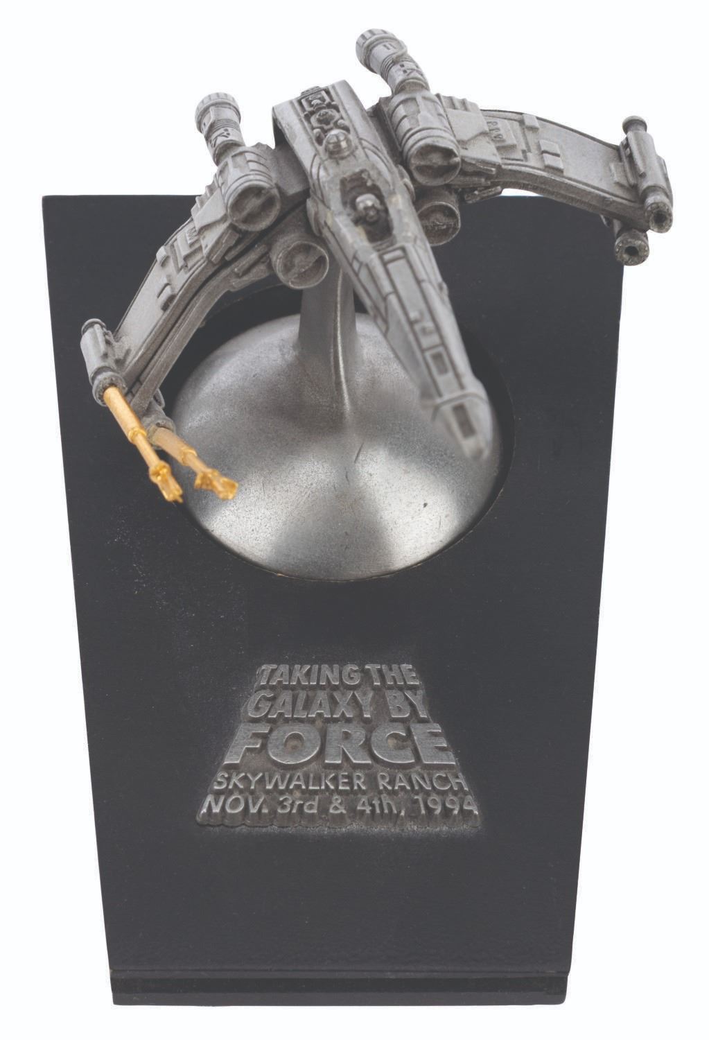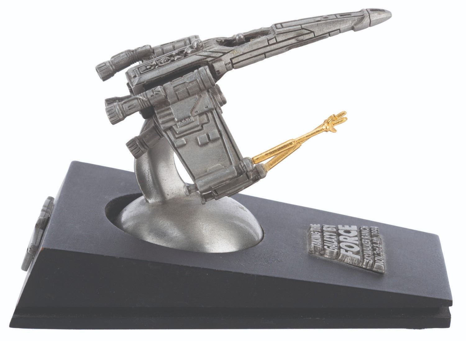 (Lucasfilm, 1994) A rare X-wing sculpture sent as an invitation to the 1994 Star Wars Summit at Skywalker Ranch. This 1994 meeting of licensees and staff is where George Lucas discussed plans for the Star Wars Special Editions and the prequel trilogy. Created in a limited edition, this sculpture is numbered 84/300. Measuring 3" x 4.5" x 3.25" tall, the sculpture is in very good condition with wear, a loose laser cannon, and two laser cannons missing.